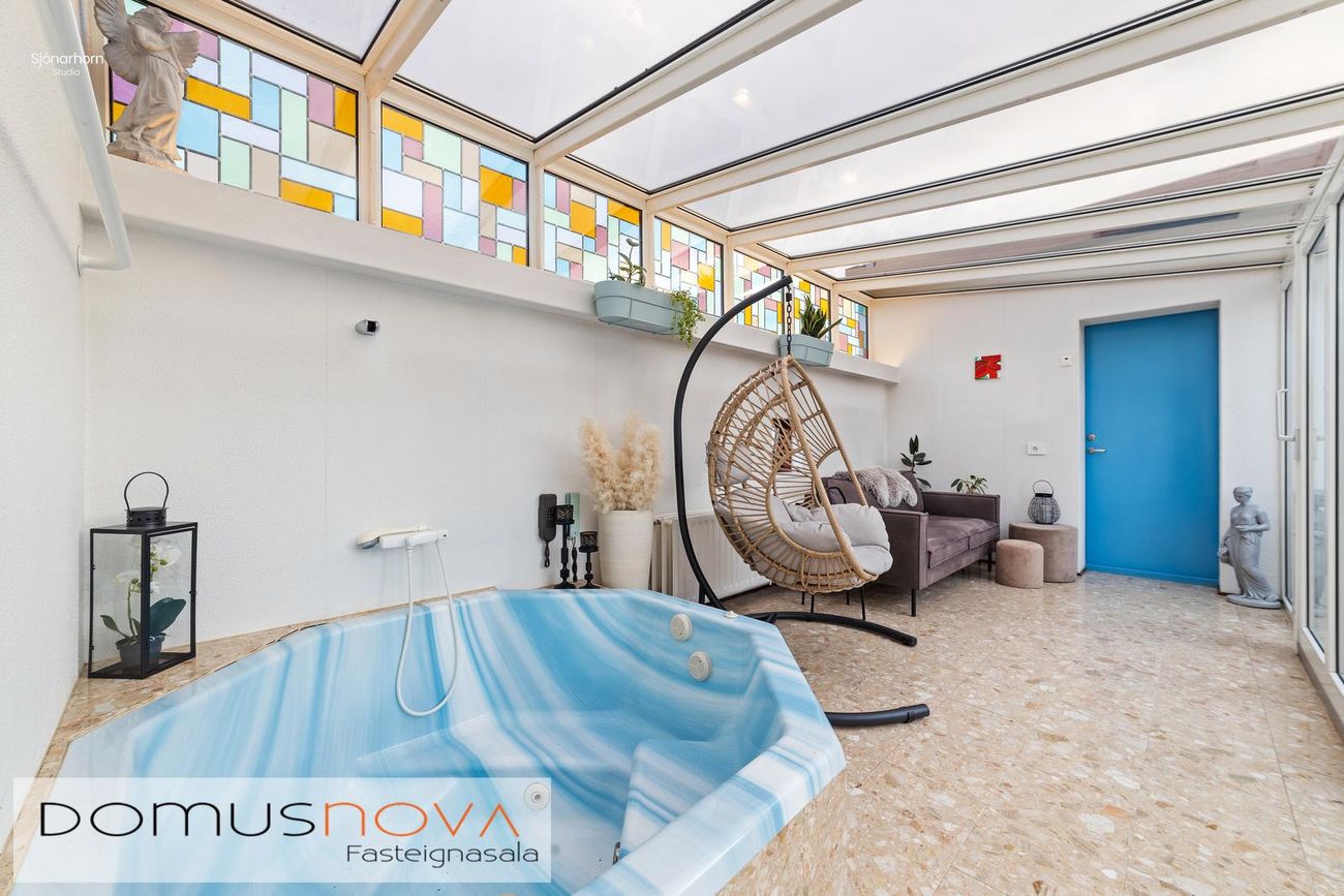 Stór garður til suðurs með góðu skjóli. Tveir sólskálar og nýjar lagnir fyrir heitan pott.