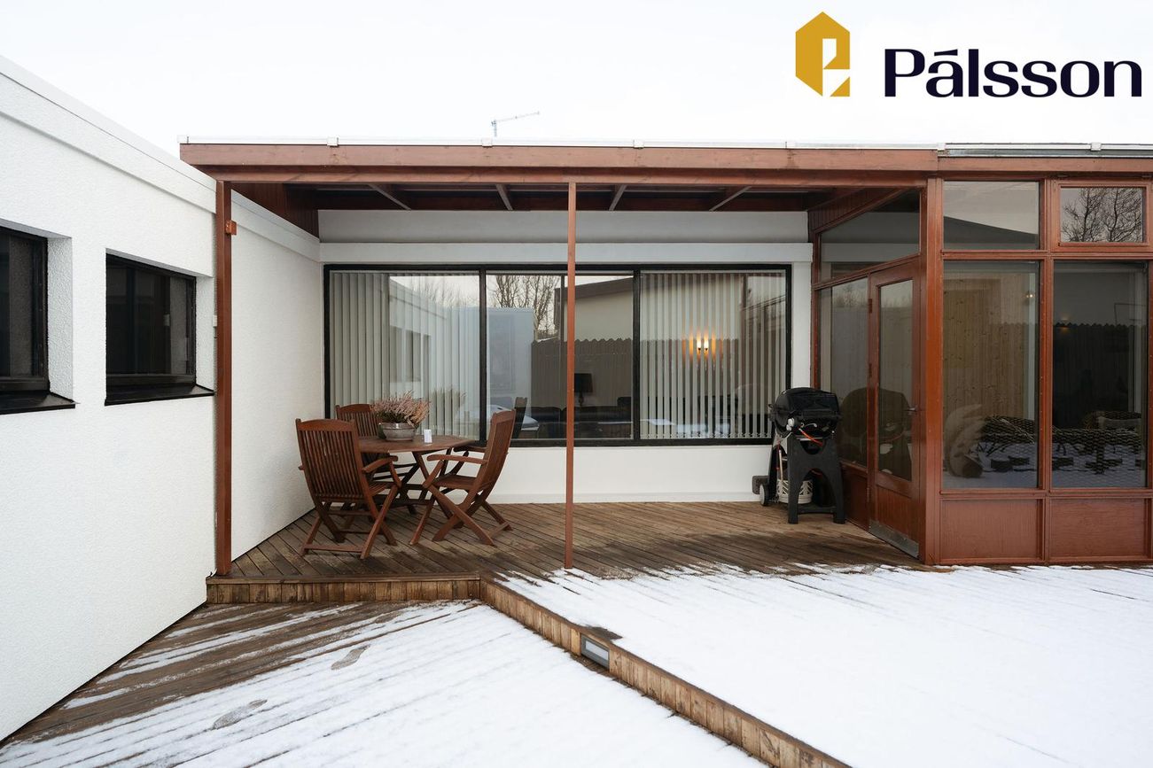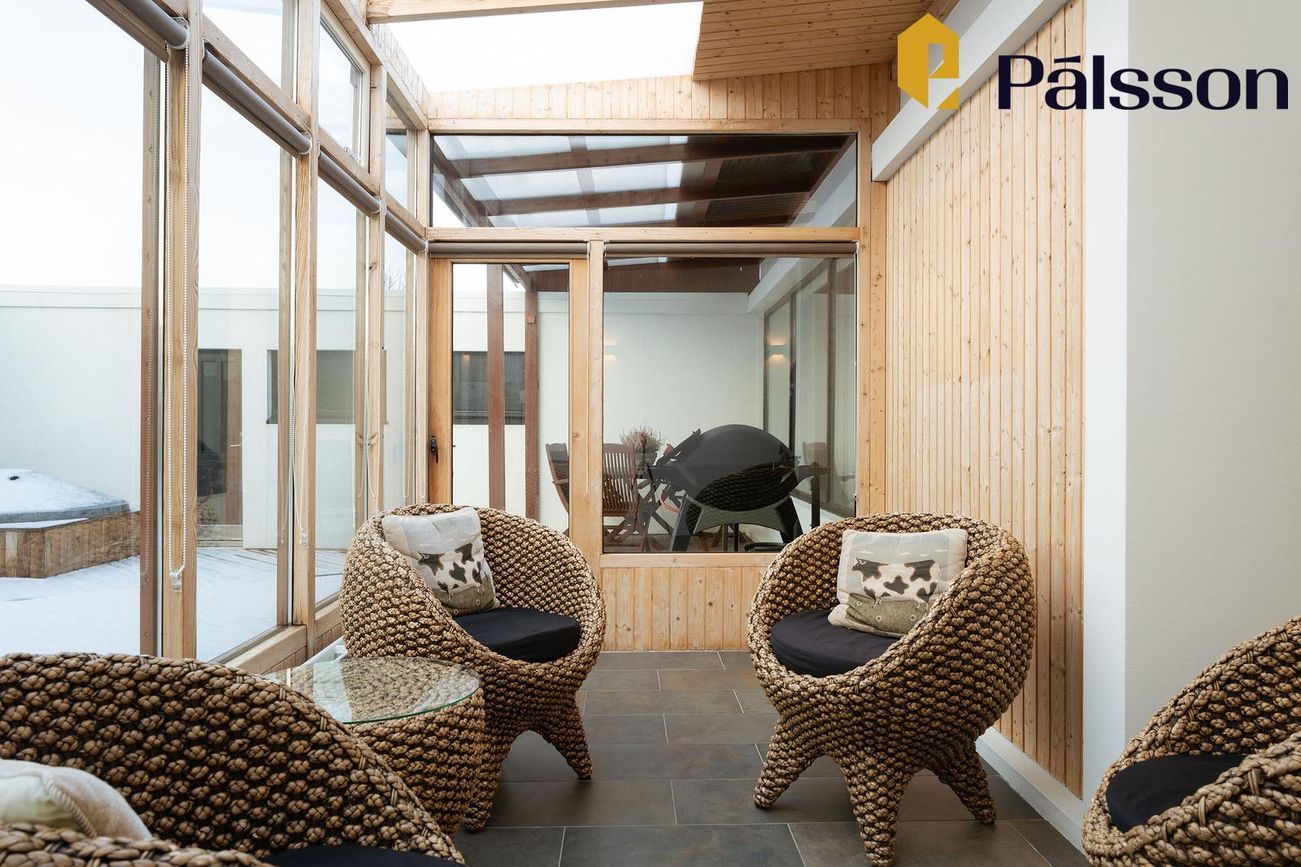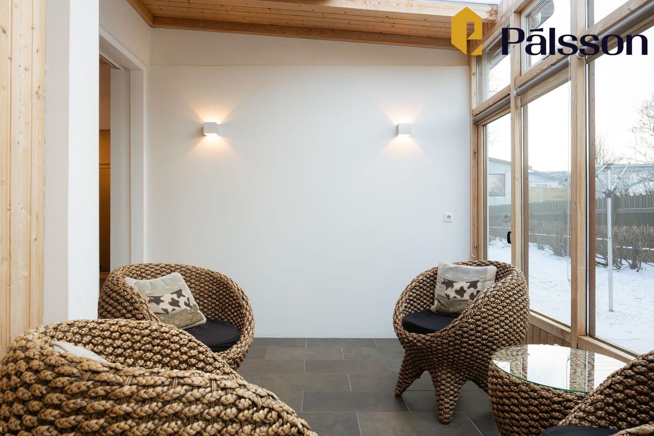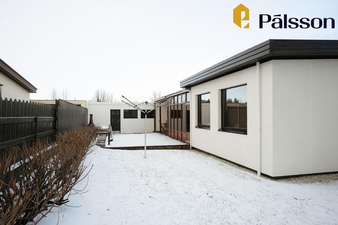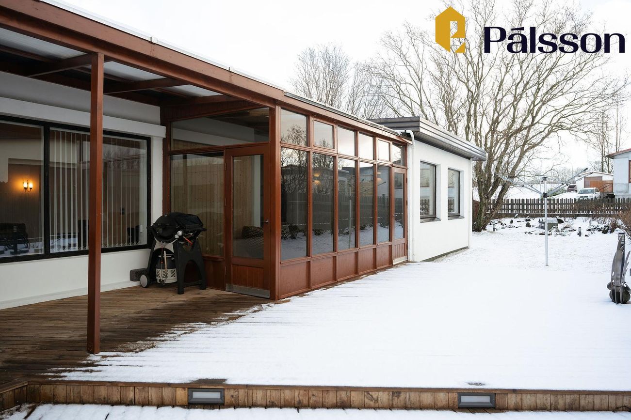 185,2m2 einbýlishús með 35,7m2 bílskúr. Þrjú svefnherbergi, garður, garðskáli og nálægð við náttúruna.