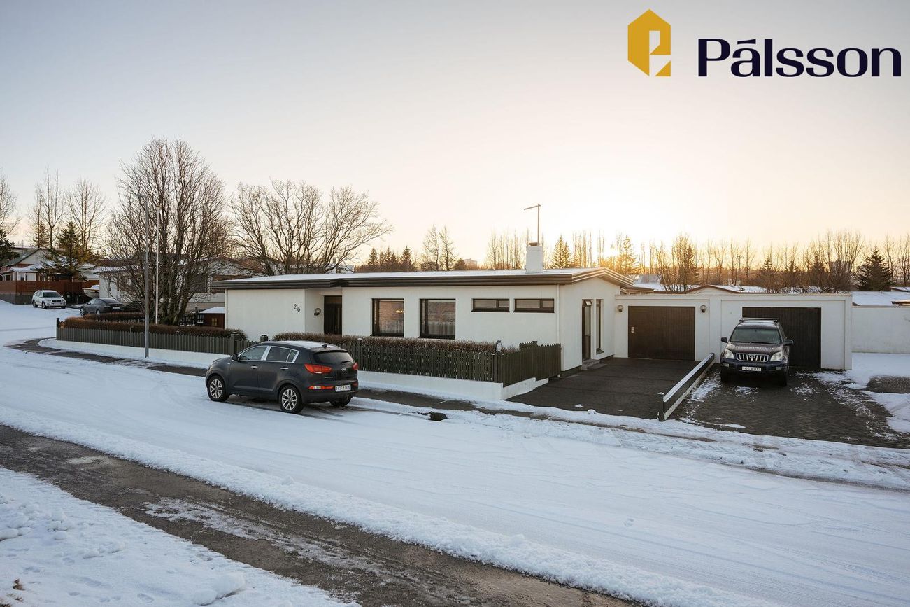Einbýlishús á einni hæð með forstofu, stofu/borðstofu, eldhúsi, þremur svefnherbergjum, baðherbergi, gestasnyrtingu, þvottahúsi og bílskúr.