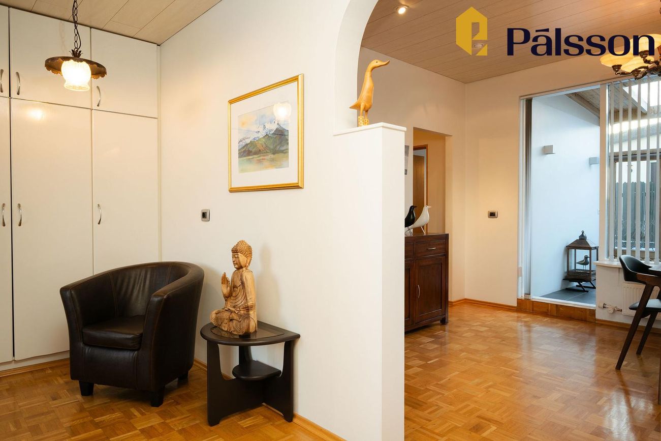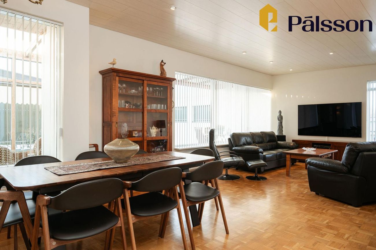 Stofa og borðstofa með parketgólfi og útigöngu í garðskála og garð.