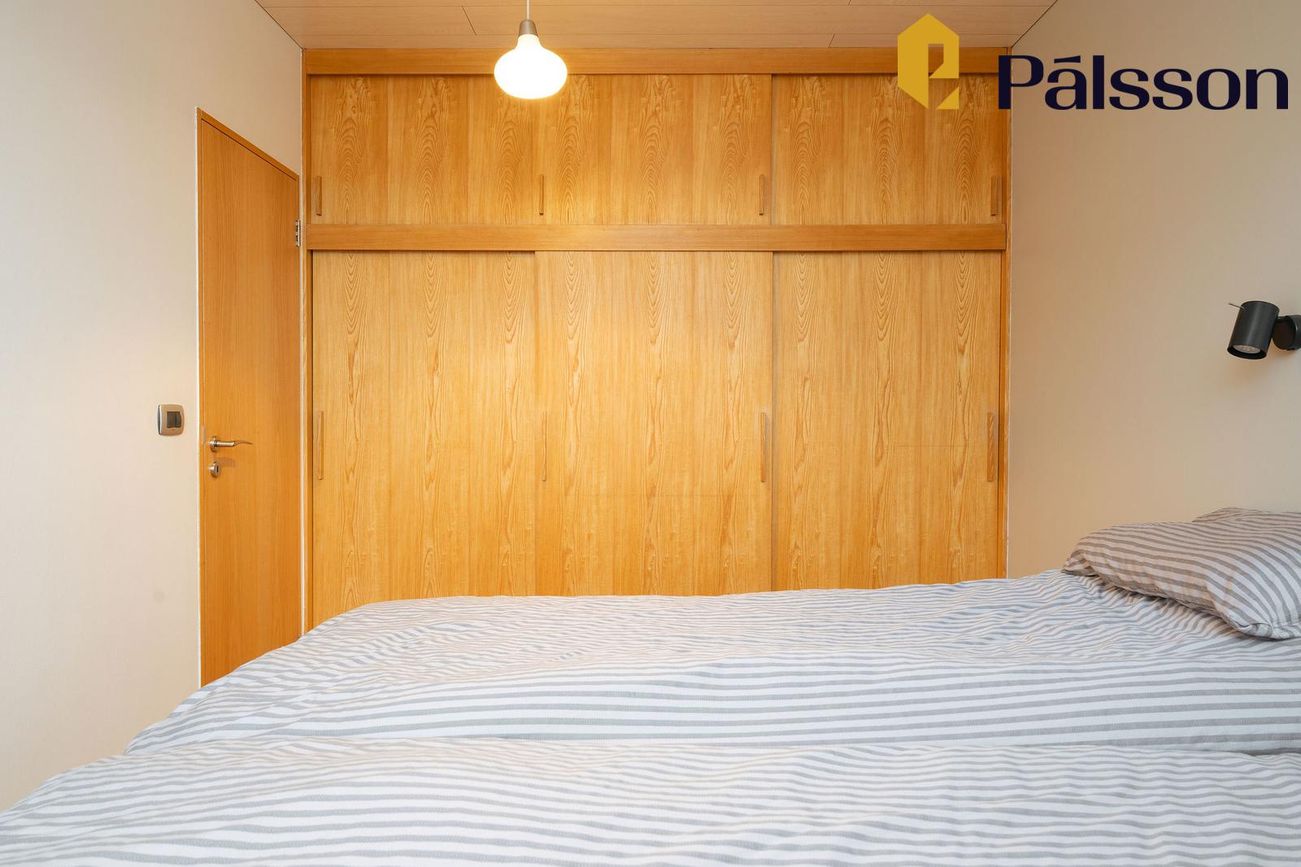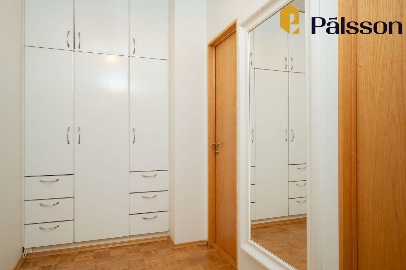 Þrjú herbergi með parketgólfi, tveir með skápa.