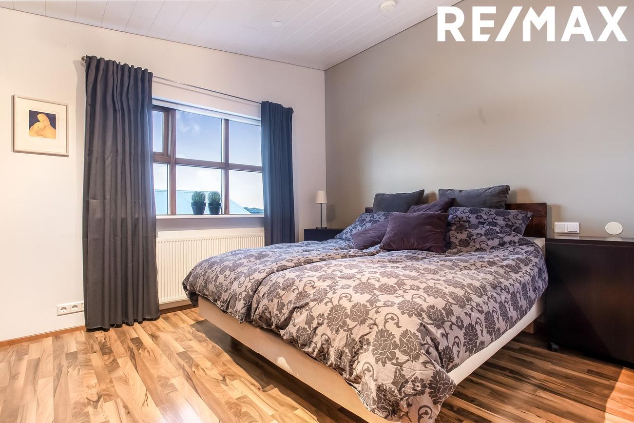 Hjónaherbergi: Parket á gólfi, rúmgott með miklu fatahirslum.
