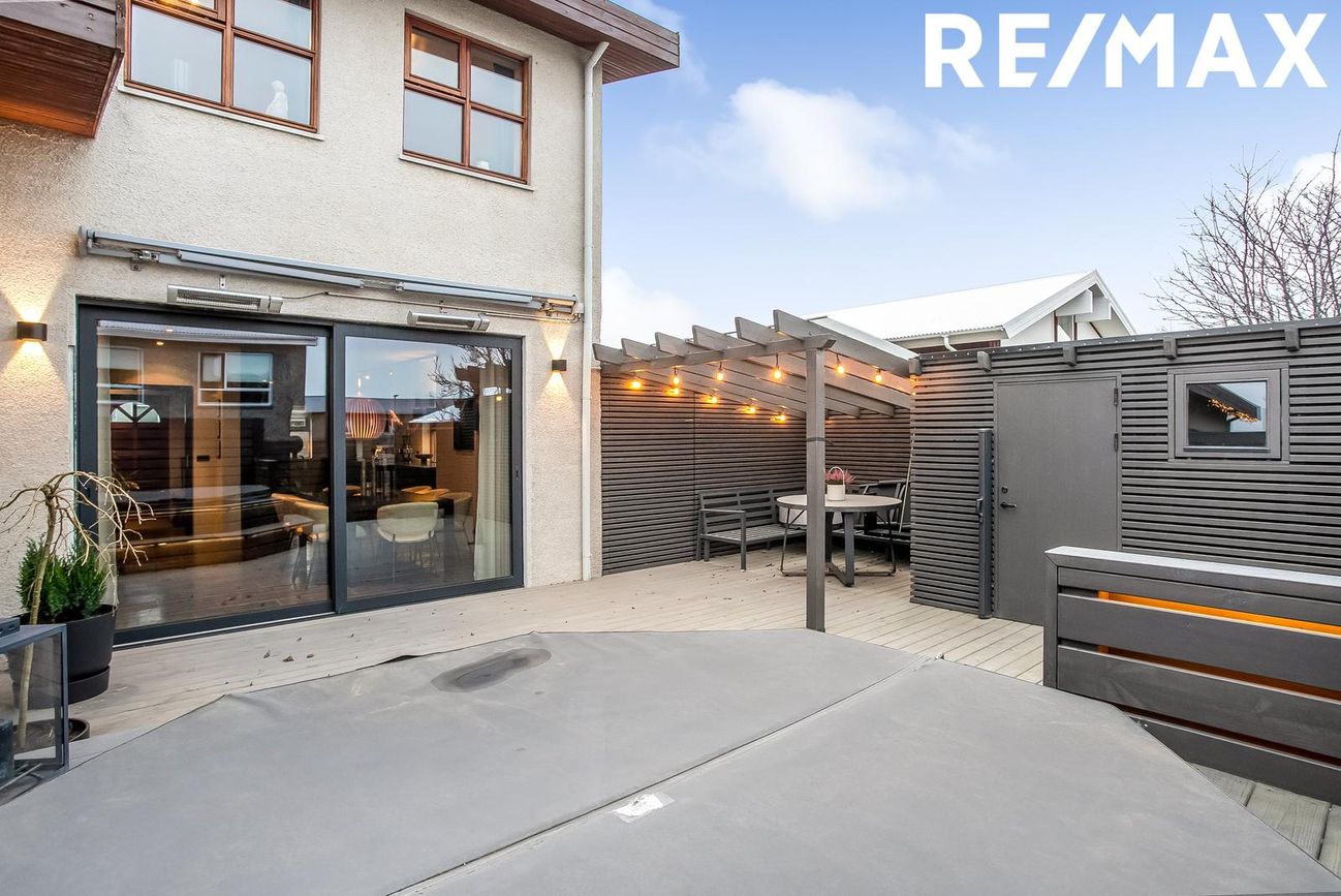 Útisvæði: Garðurinn er fallegur, með timburverönd í bland við viðhaldslítiln gróður. Á pallinum er heitur pottur og snyrtileg setustofa ásamt útigeymslu.
