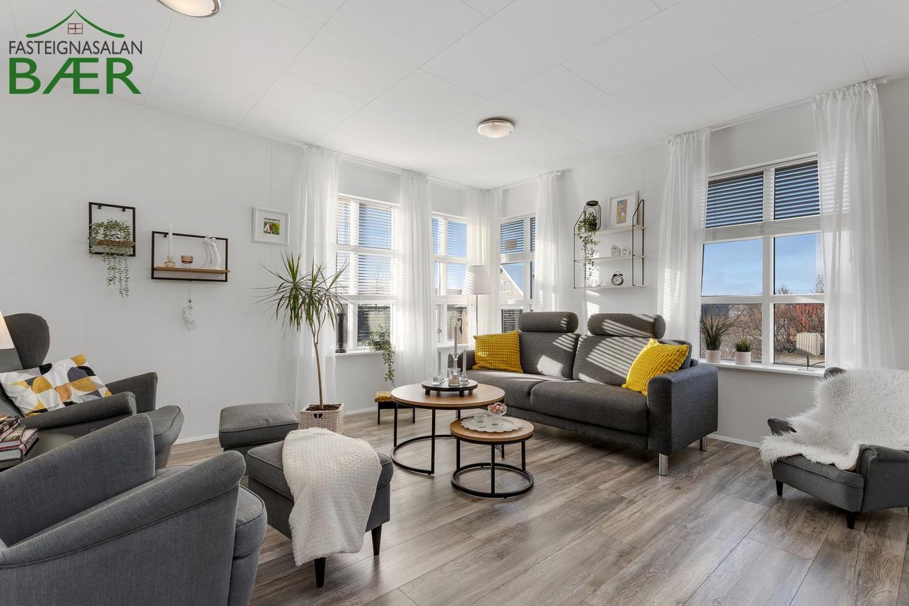 Rúmgóð og björt stofa með borðstofa, gluggar á þrjá vegu og útgengi á suðurverönd.