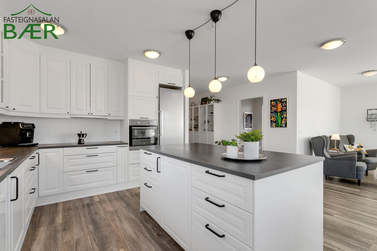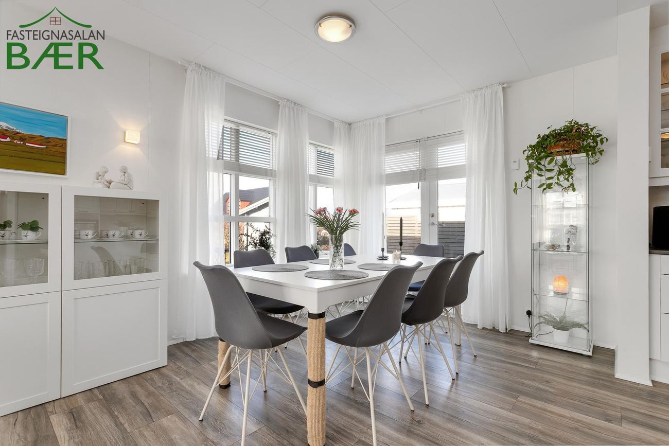 Ytra klæðning: lituð álklæðning. Gólf: harðparket í forstofu, eldhúsi, stofu og herbergjum; flísar í baðherbergi og þvottahúsi.