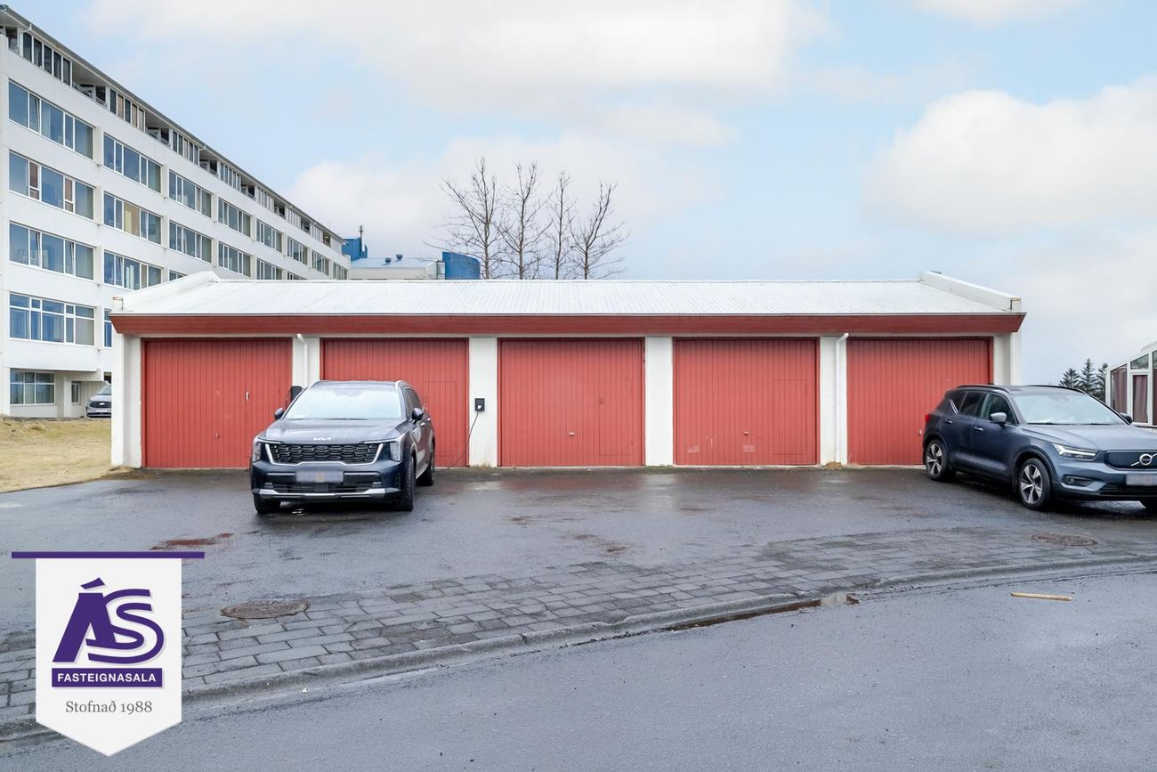 Bílskúr er í bílskúrslengju með steyptu gólfi og rafmagnopnara. Gluggar í enda bílskúrs.