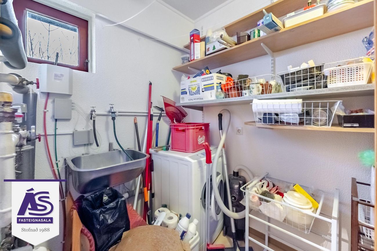 Þvottahús: Er rúmgott með dúk á gólfi, tengi fyrir þvottavél. Opnanlegur gluggi og hillur.