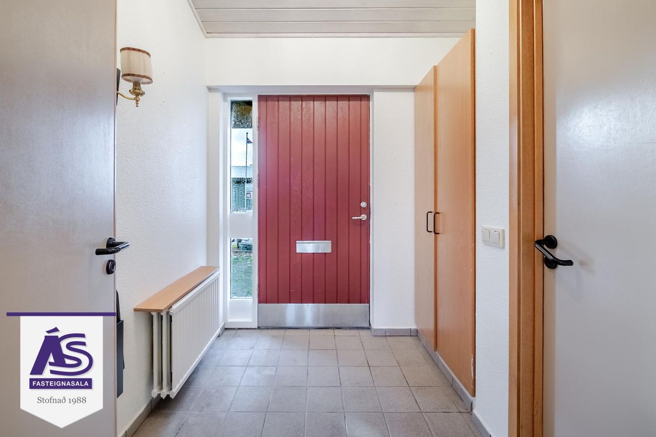 Eignin er laus við kaupsamning!Nánari lýsing:Forstofa: Með fataskápum og flísum á gólfi.