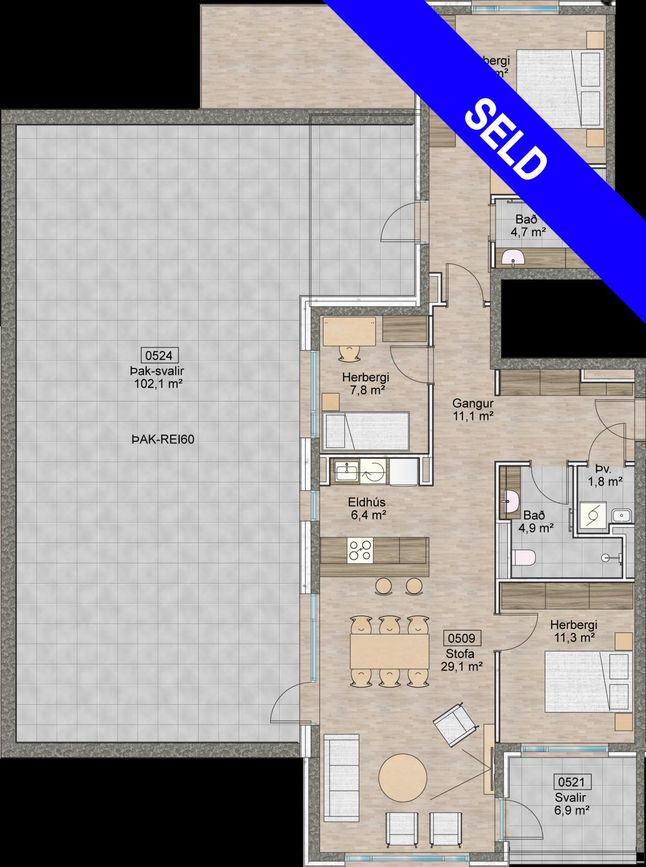 • Þar sem minnst er á gerð tækja í innréttingum í skilalýsingu er átt við tæki af sambærilegri gerð og gæðum. Sama á við um birgja og efnissala. Seljandi áskilur sér rétt til breytinga á byggingartímanum en er þá miðað við sambærilega vöru.