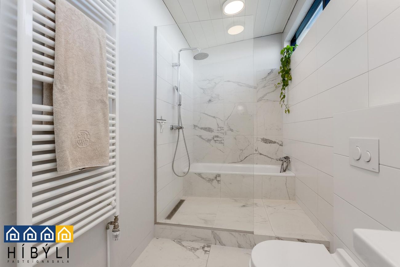 Baðherbergi: Endurnýjað fyrir fáeinum árum, flísar á veggjum og gólfi. Hvít innrétting undir vaski, flísalögð sturta með glerhlið, baðkar með flísalagðri hlið, gluggi með rafmangsopnun, hiti í gólfum.