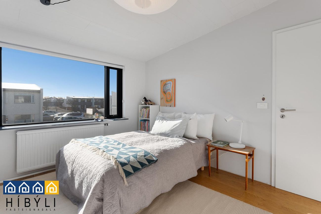 Herbergi 2: Rúmgott hjónaherbergi með parketi á gólfi, fataskápum og útgengi á suðursvalir.