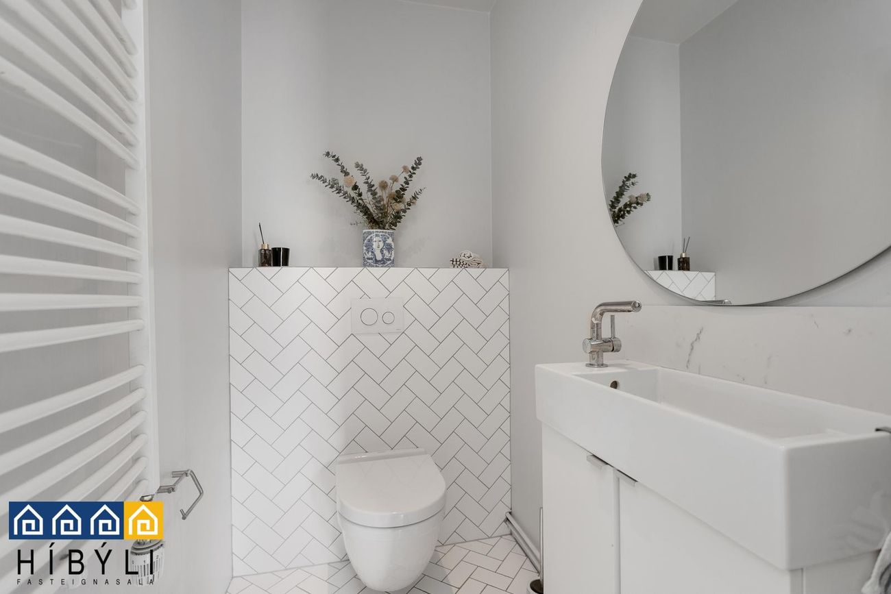 Gestasalerni: Við forstofu, flísar á gólfi, upphengt salerni, hvít innrétting undir vaski, handklæðaofn. Hiti í gólfum í forstofu og á gestasalerni.