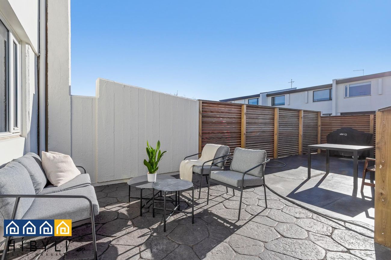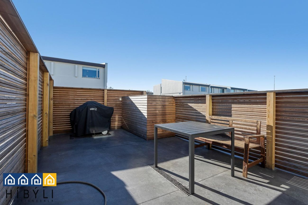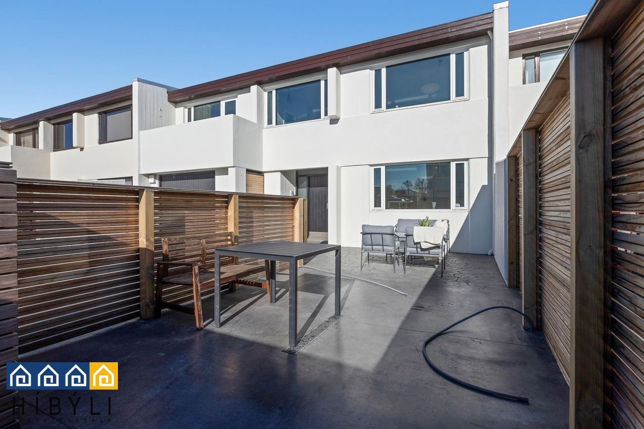 afgirt verönd með nýlegum timbur skjólveggjum sem snýr í suður. Veröndin er með hitalögnum undir.