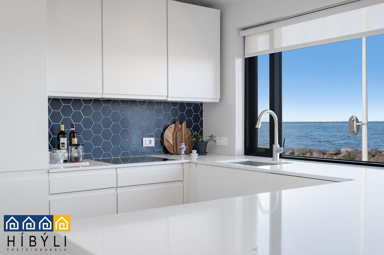 Eldhús er með hvítri endurnýjaðrin innréttingu, mjög gott skápa og vinnupláss, eyja áföst við vegg, quartz borðplötur frá Granítsmiðjunni, parket á gólfi, gluggi með miklu útsýni.