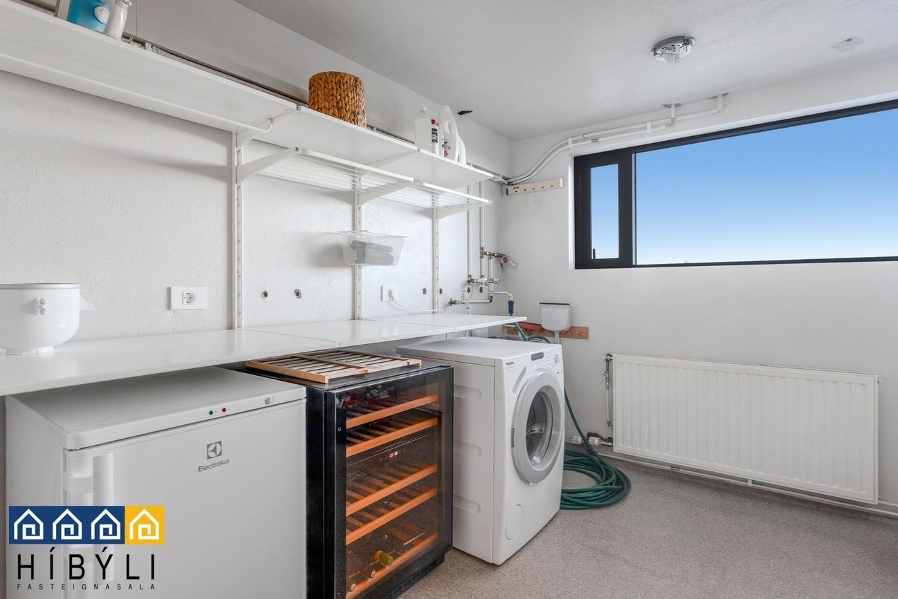 Þvottahús: Rúmgott þvottahús með epoxy á gólfi, vegghillur, gluggi.
