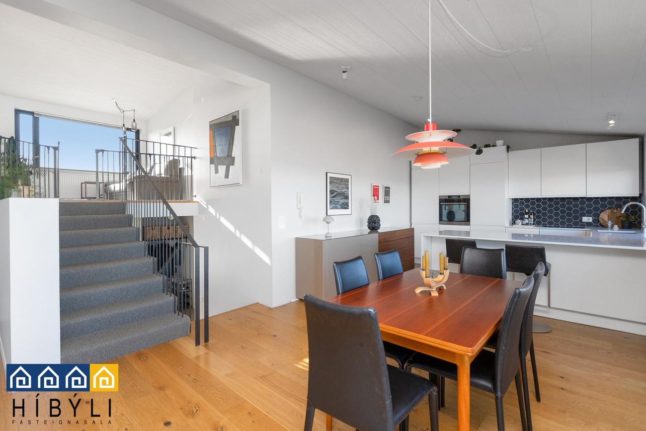 Bjartar samliggjandi stofur, aukin lofthæð, parket á gólfum,