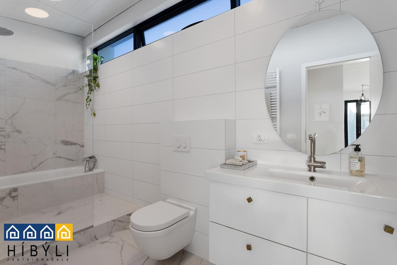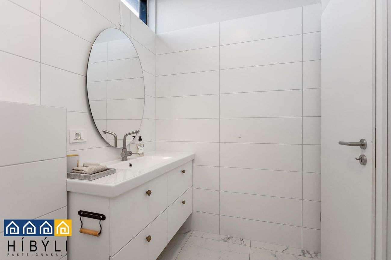Gestasalerni: Við forstofu, flísar á gólfi, upphengt salerni, hvít innrétting undir vaski, handklæðaofn. Hiti í gólfum í forstofu og á gestasalerni.