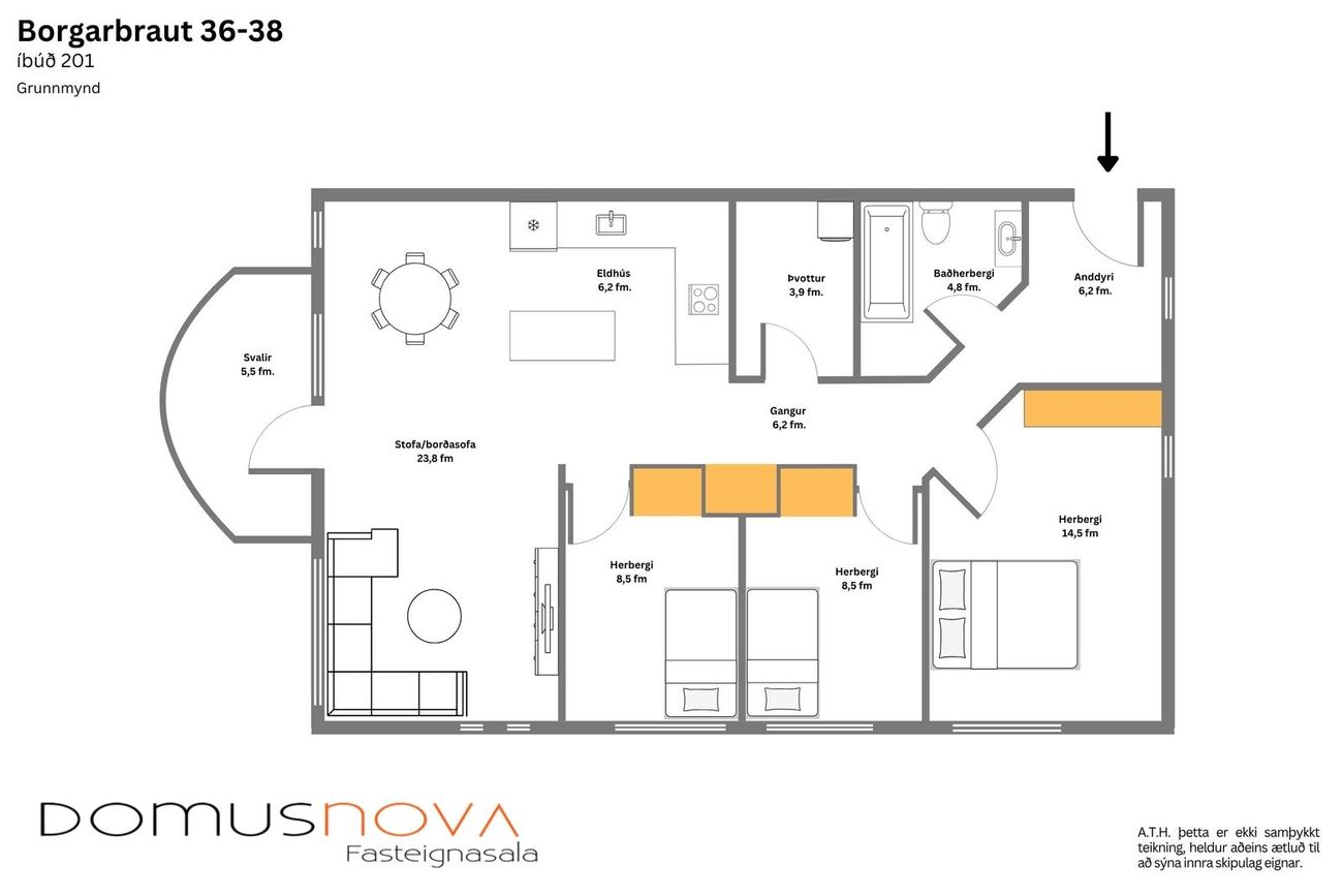 Domusnova Borgarnesi kynnir í sölu íb. 201 að Borgarbraut 36-38, 310 Borgarnes. Björt og vel skipulögð 104,6 fm. 4ja herbergja endaíbúð á 2. hæð með sérinngang og sérgeymslu. Frábær staðsetning miðsvæðis.**BÓKIÐ SKOÐUN hjá Sjöfn, lgf. í síma 691-4591 eða á netfangið sjofn@domusnova.is**Borgarbraut 36-38 er 2ja hæða fjöleignarhús með kjallara undir hluta hússins, byggt árið 2005 úr forsteyptum einingum. Í húsinu eru 10 eignir, fimm á hvorri hæð. Í kjallara hússins eru sérgeymslur íbúða ásamt 67,3 fm. hjóla- og vagnageymslu. Lóðin er 1705,0 fm og liggur austan Borgarbrautar og sunnan Böðvarsgötu.