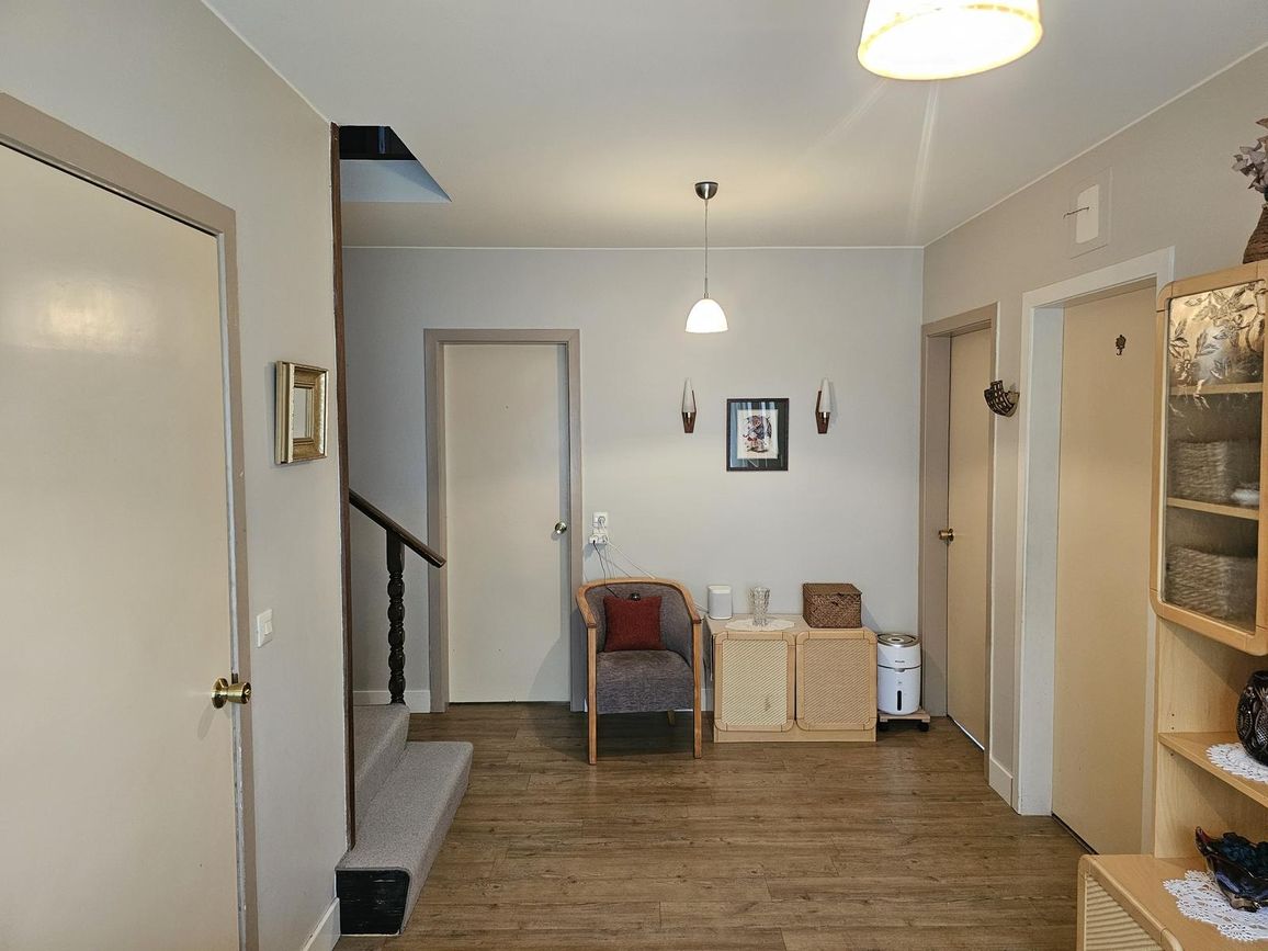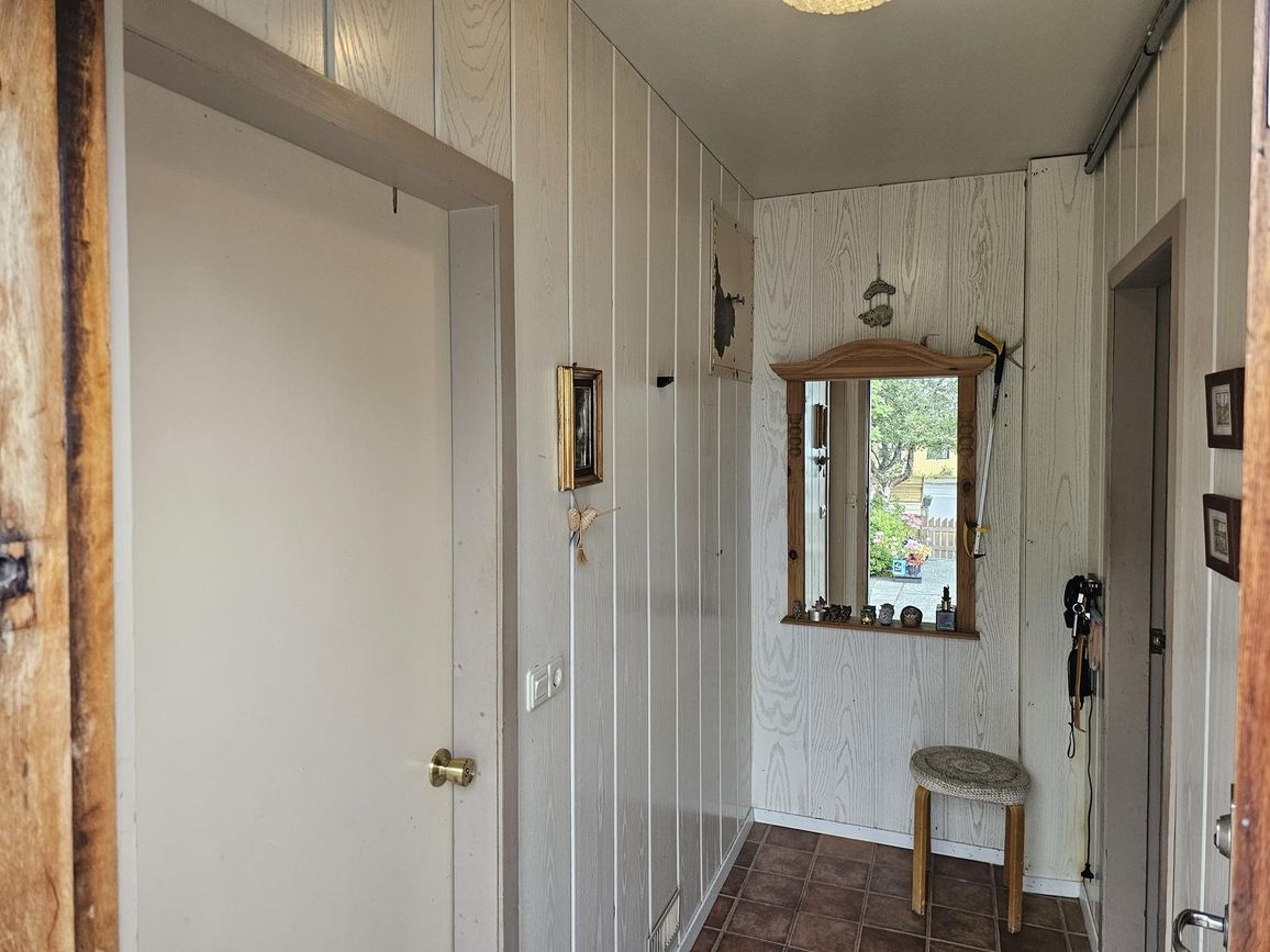Hol er inn af anddyri, vinil parket á gólfi.
