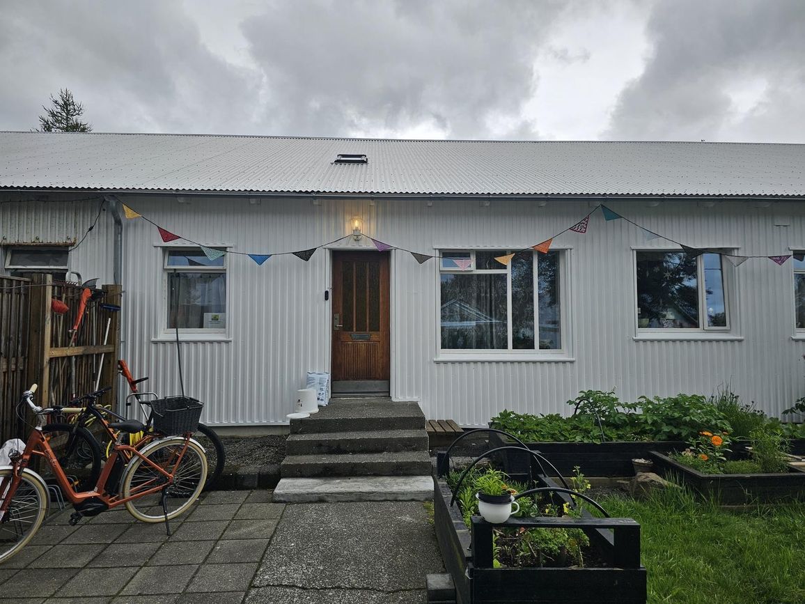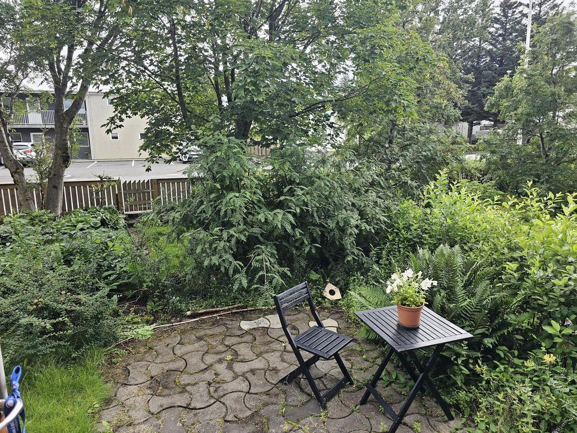 Stofa og borðstofa vinilparket. Gengt er um svalahurð úr stofu út í garð. Auðvelt að loka vegg á milli og bæta þannig við svefnherbergi.