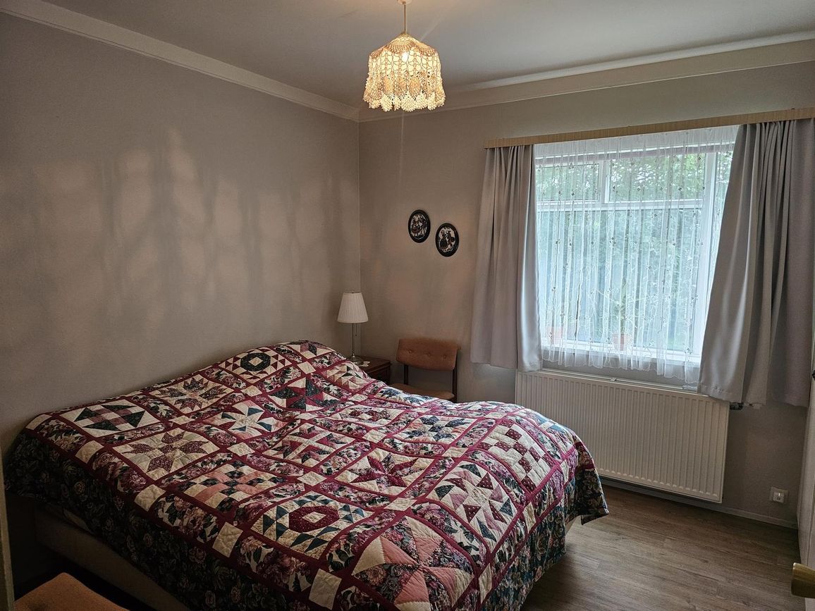2 svefnherbergi á efri hæð, teppi á gólfum.