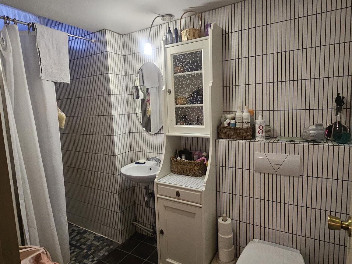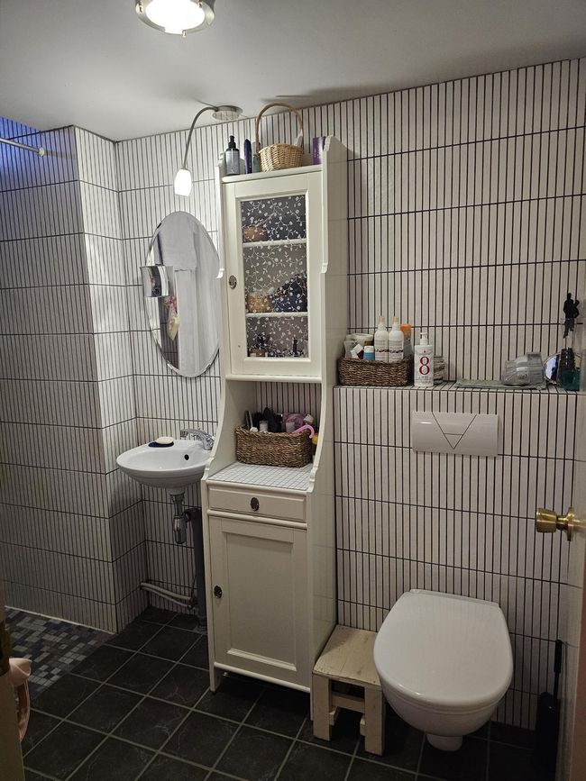 Baðherbergi á neðri hæð flísalagt í hólf og gólf. Innrétting, vegghengt salerni og sturta.