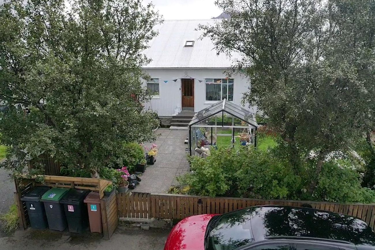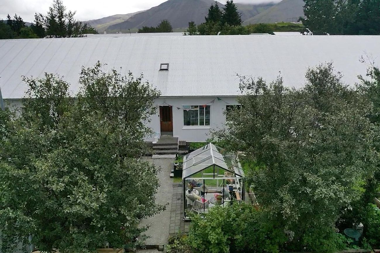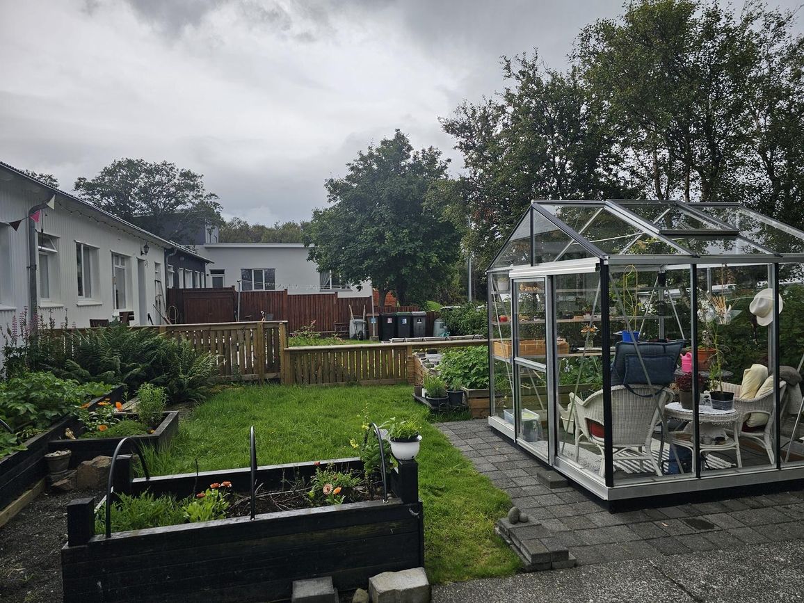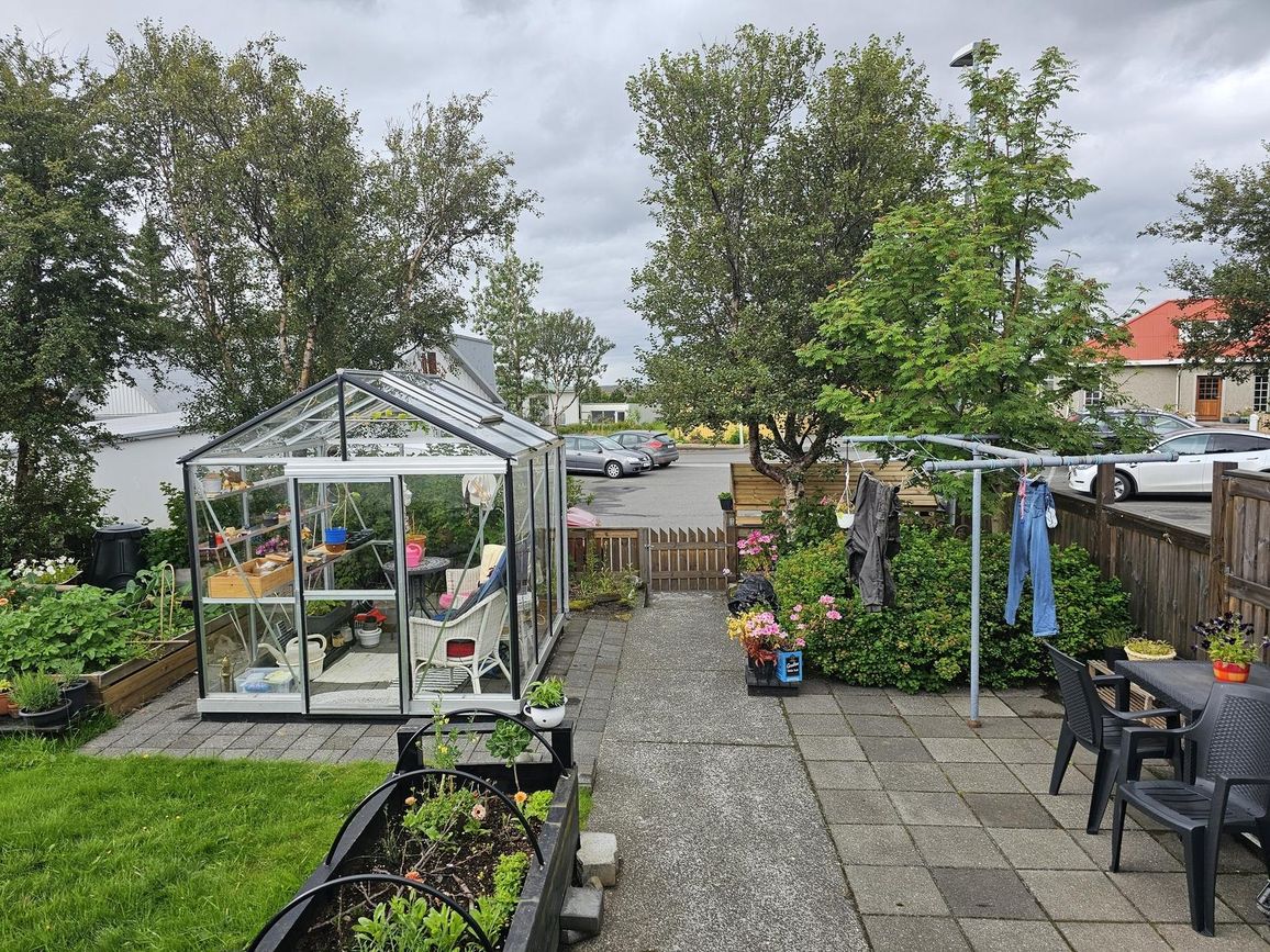 Lóðin er vel hirt og gróin með hellulögnum, gróðurhúsi, trjágróðri, skrautjurtum og grasflöt.