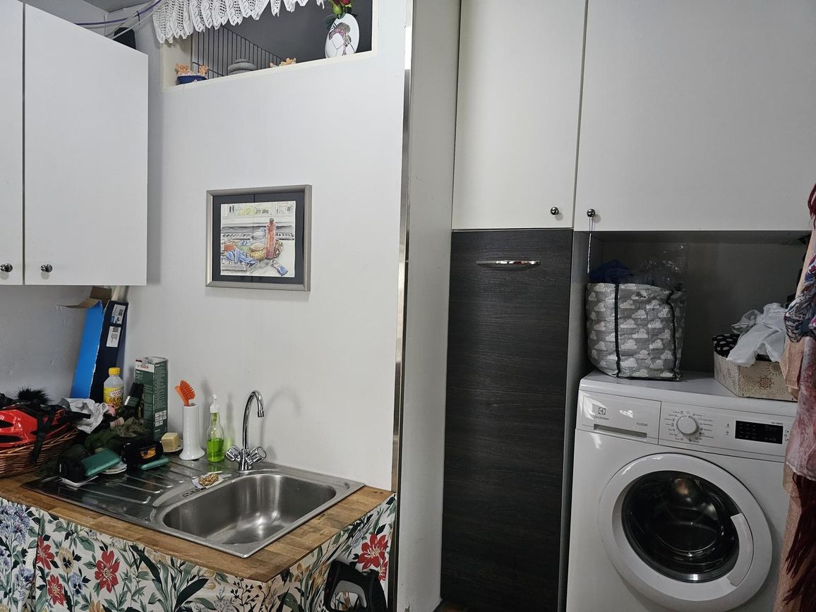 Þvottahús flísar á gólfi og innrétting.