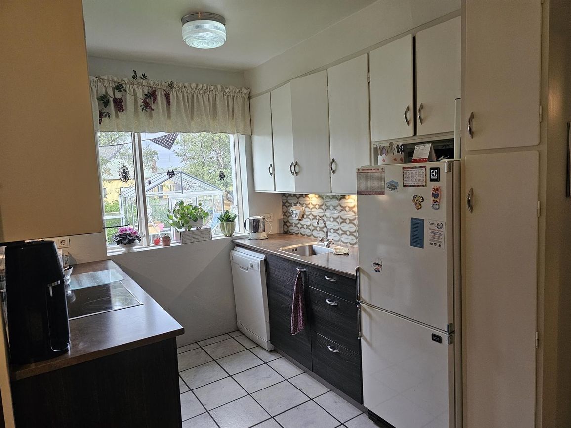Eldhús með góðri innréttingu og borðkrók. Flísar á gólfi. Inn af eldhúsi er búr með glugga, flísalagt gólf og góðu hilluplássi.