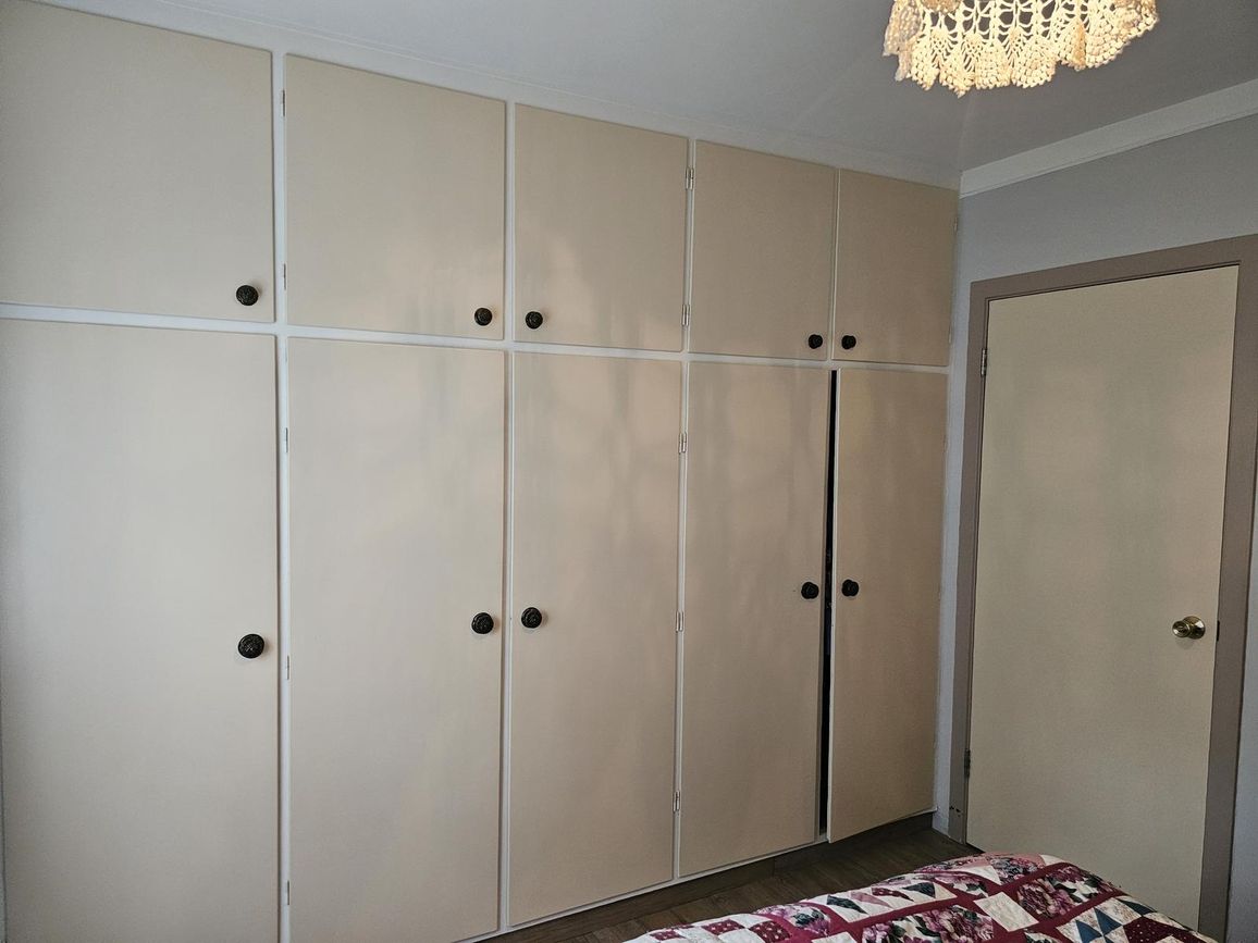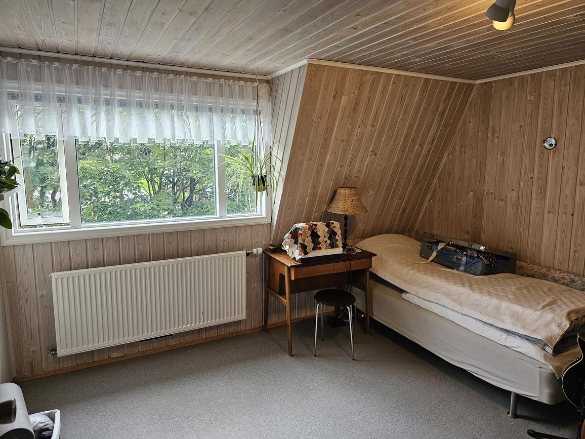 Svefnherbergi á hæðinni með parket á gólfum og rúmgóðum skápum.
