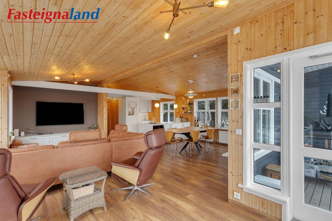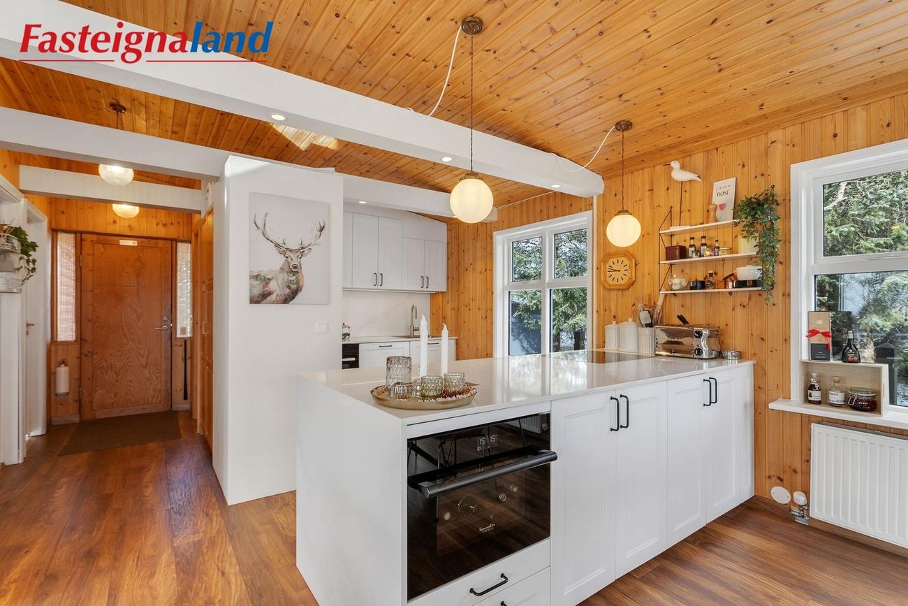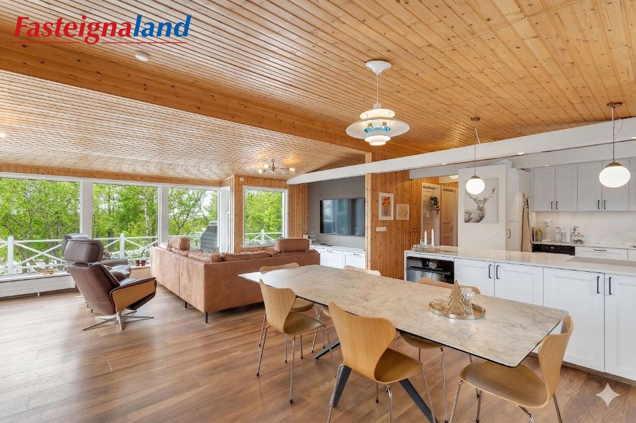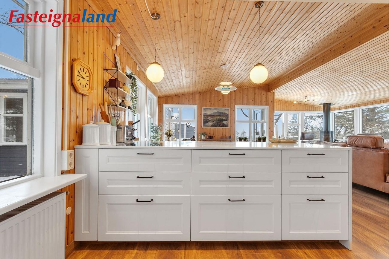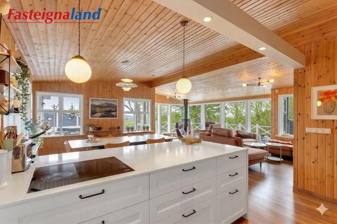 stofa og borðstofa flæða saman. Eldhúsið var stækkað verulega árið 2021. Þar er nú stór eldunareyja, mikil skápainnrétting með granít borðplötum og vönduð tæki, þ.m.t. vínkælir, spanhelluborð og innbyggður ísskápur. Stofan er opin og rúmgóð með fallegri frístandandi