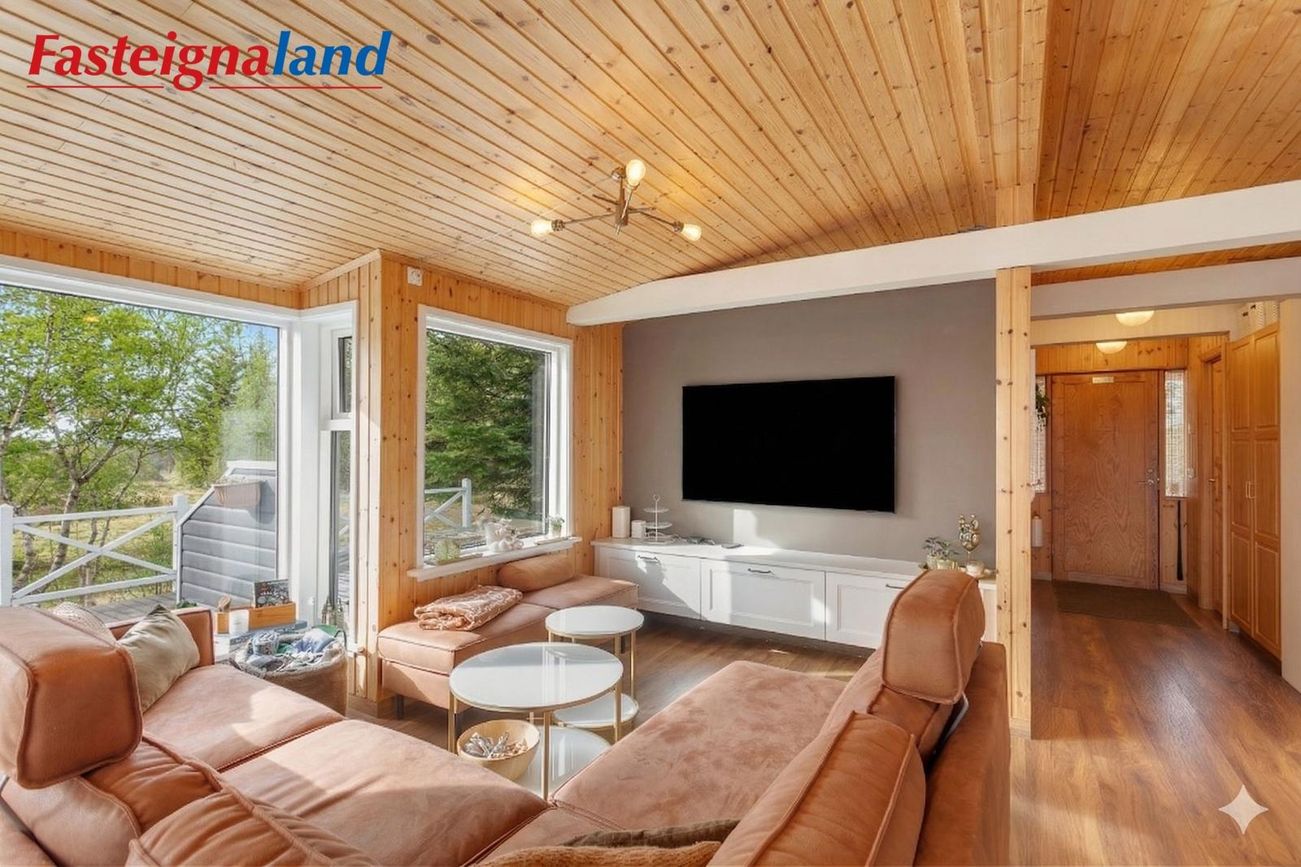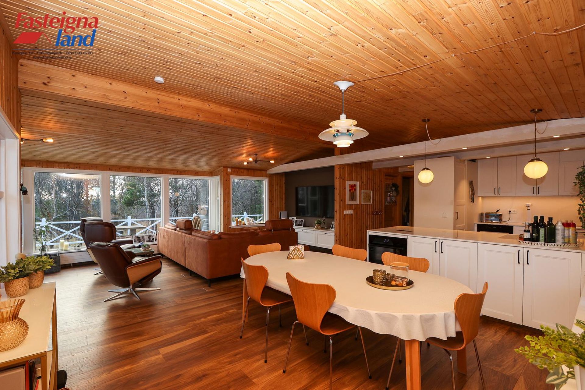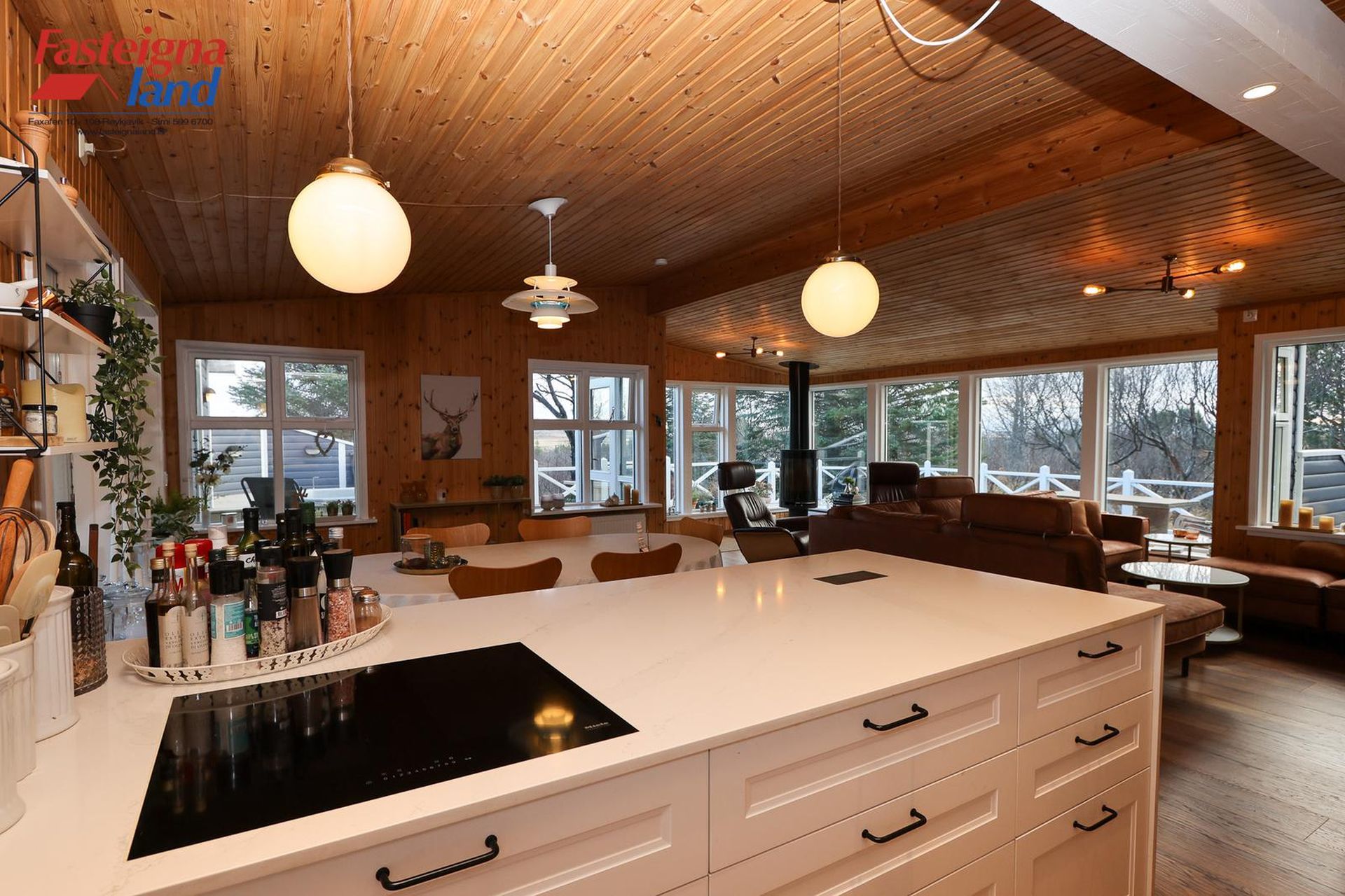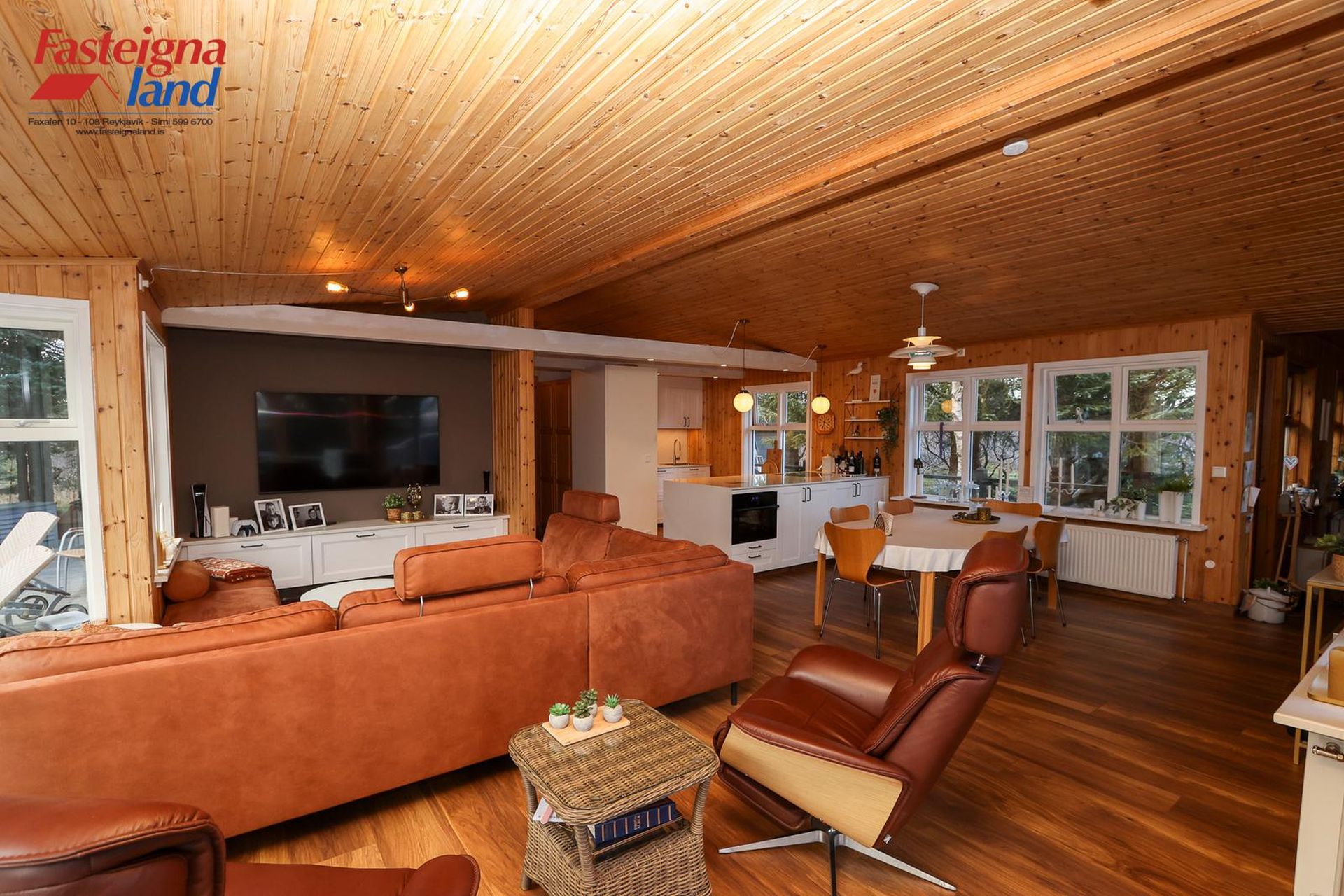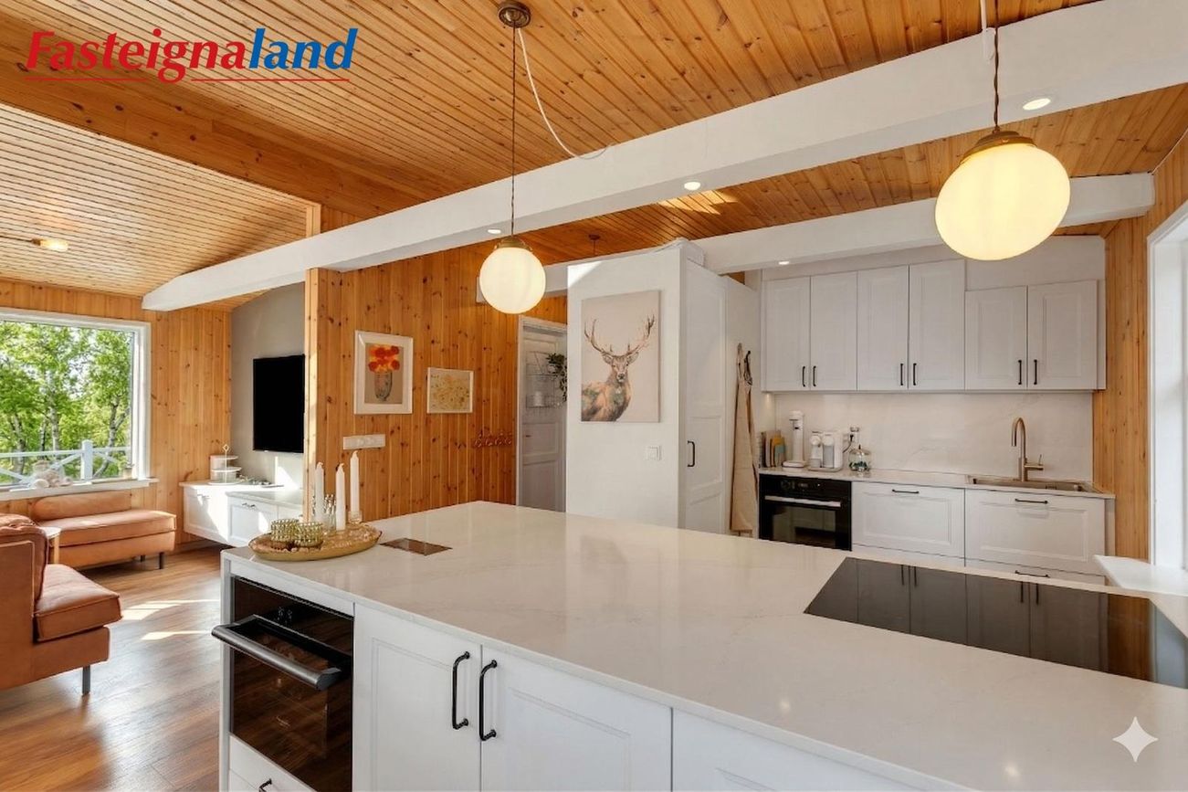 stofa og borðstofa flæða saman. Eldhúsið var stækkað verulega árið 2021. Þar er nú stór eldunareyja, mikil skápainnrétting með granít borðplötum og vönduð tæki, þ.m.t. vínkælir, spanhelluborð og innbyggður ísskápur. Stofan er opin og rúmgóð með fallegri frístandandi