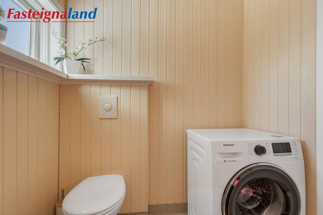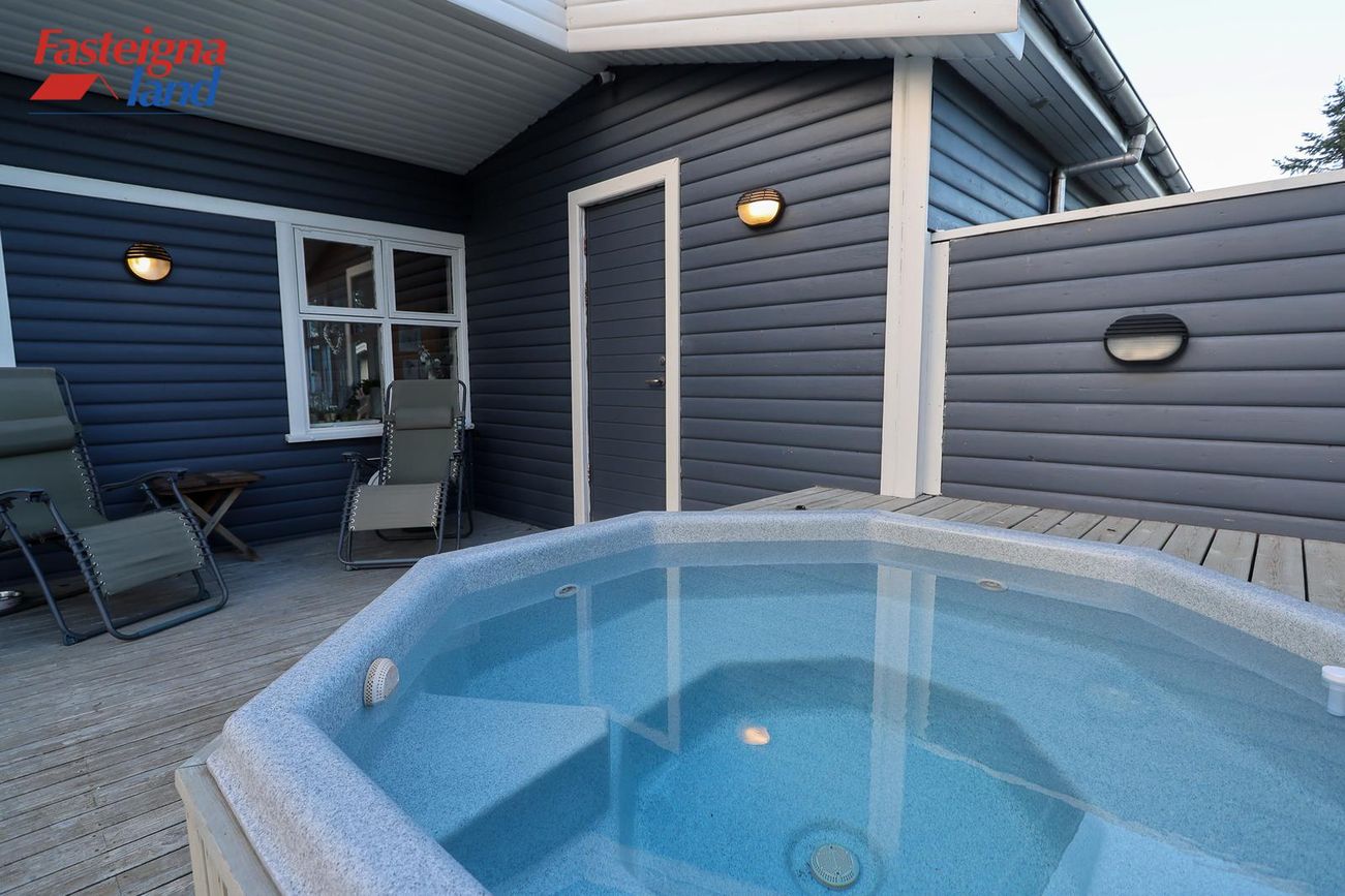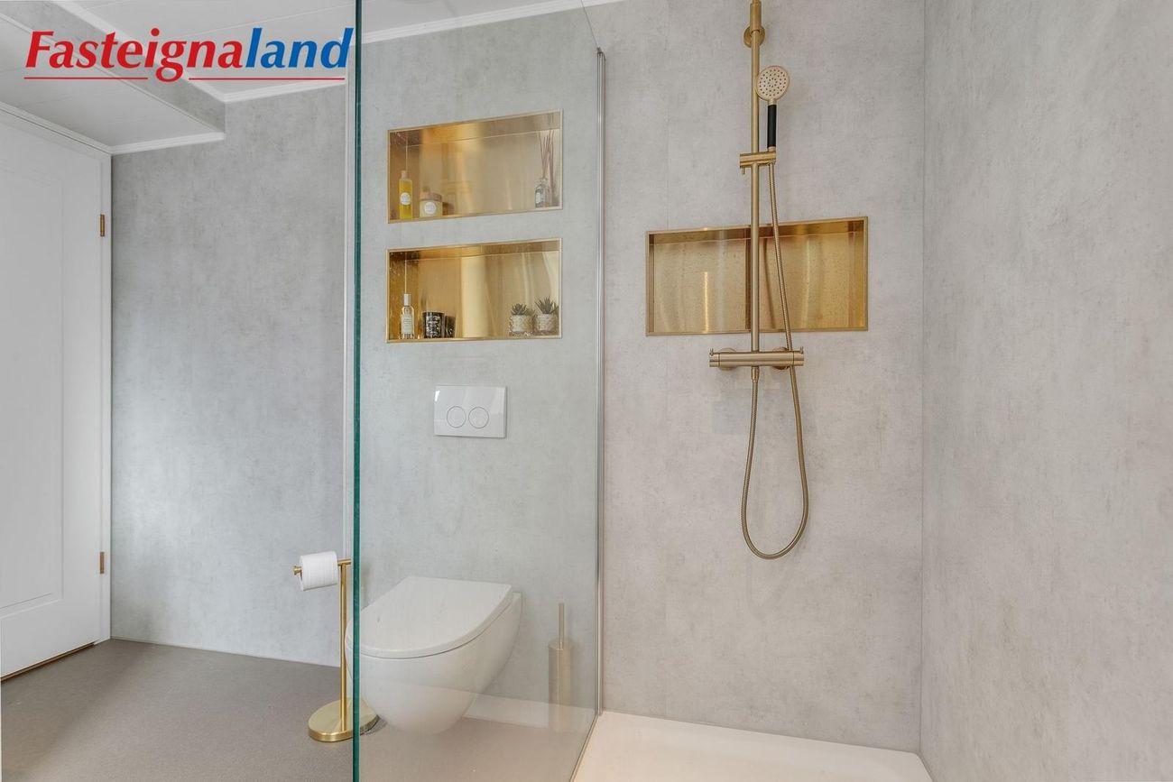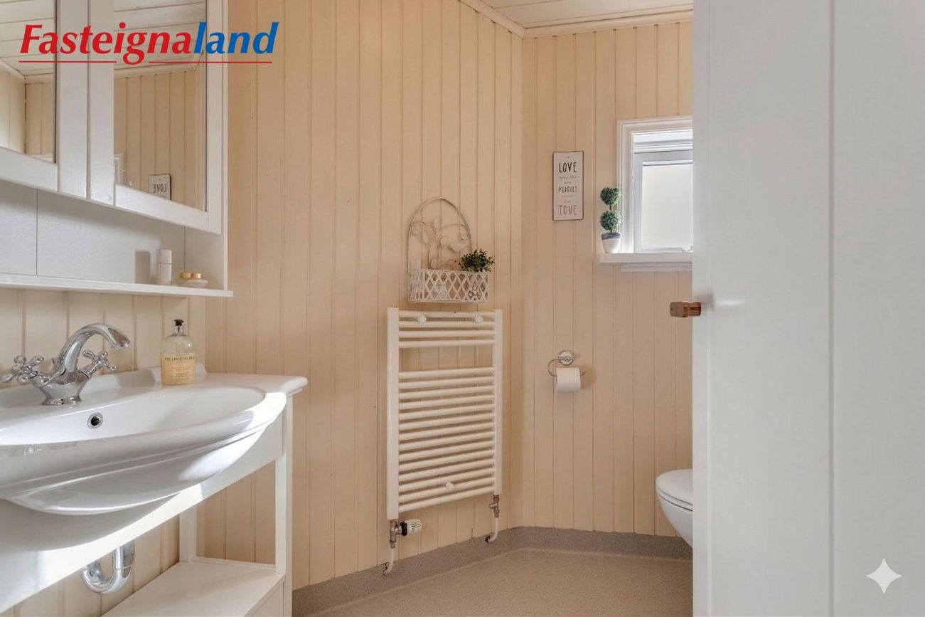 Baðherbergi og þvottaaðstaða: Stóra baðherbergi hússins var endurnýjað að fullu árið 2025 með nýjum tækjum og innréttingum og í dag er innangengt í það og útgengt að heitum potti.