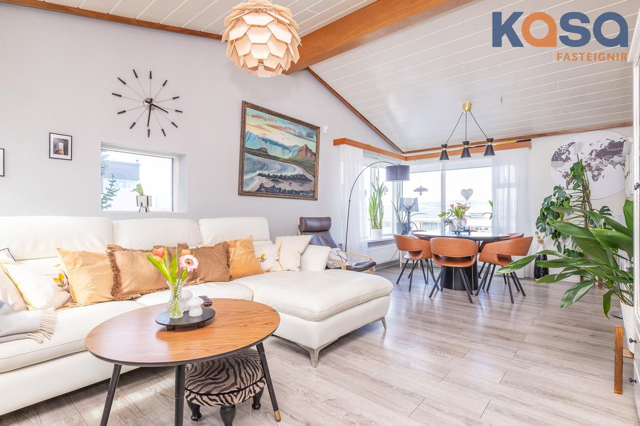 Efrihæð skiptist í : Stofa og Borðstofa, eldhús, búr, baðherbergi og tvö svefnherbergi.Forstofa: Er með rúmgóðum fataskáp og flísum á gólfi.