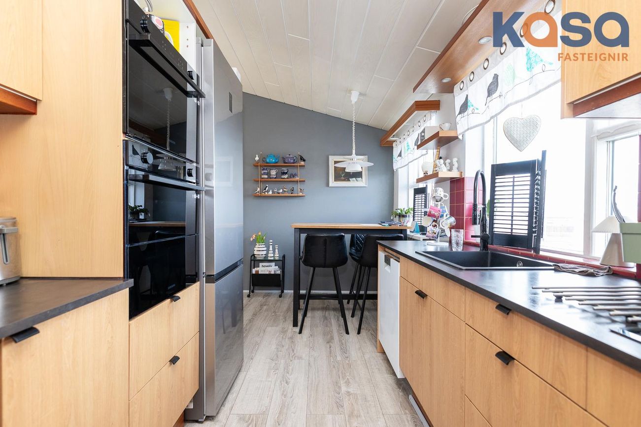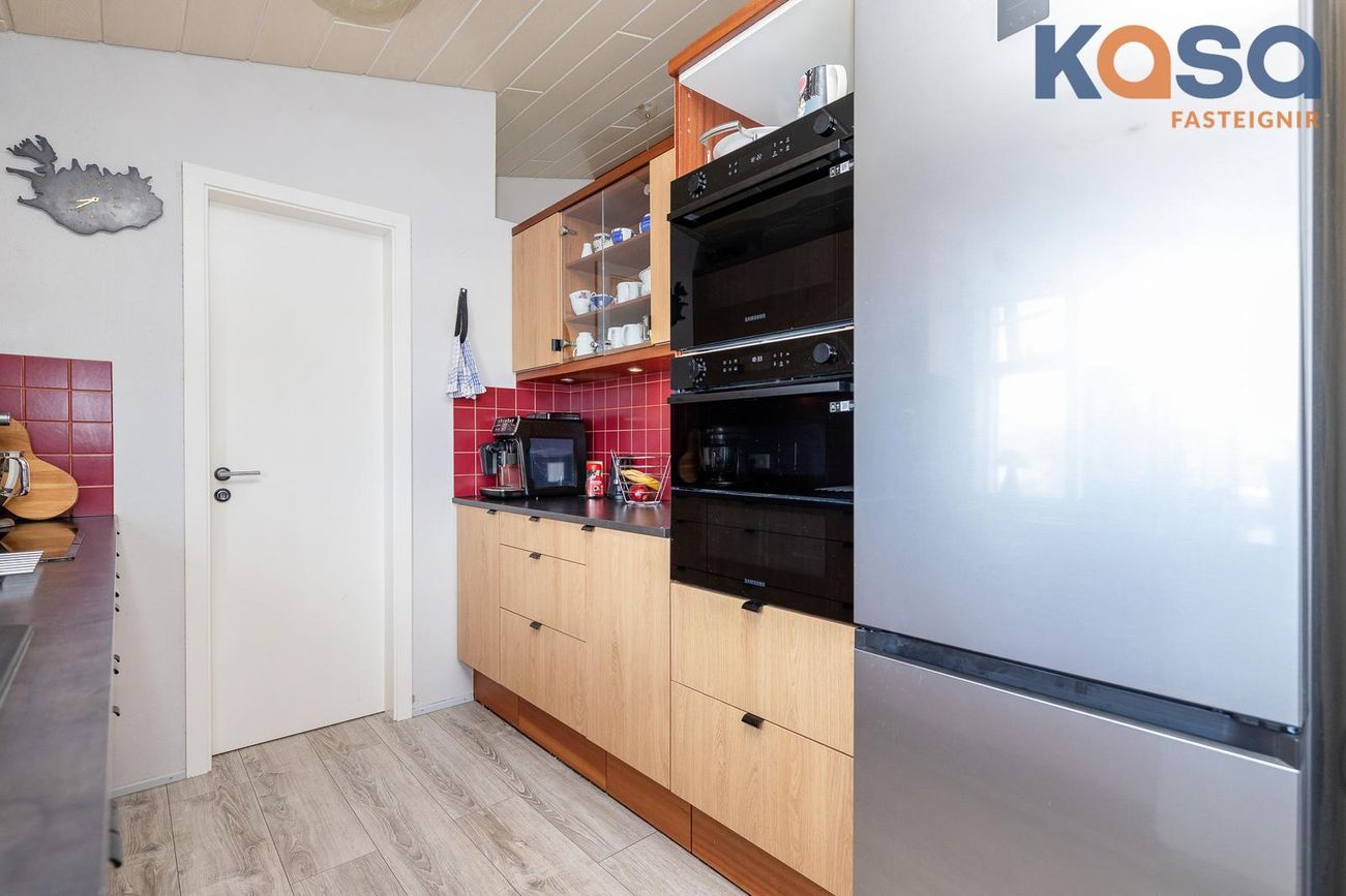 Eldhús: Búið er að endurnýja fronta og borðplötur í eldhúsi. Bakaraofn, combiofn og helluborð eru einnig nýleg. Góð innrétting með þokkalegu skápa og skúffuplássi. Pláss fyrir uppþvottavél og ísskáp í innréttingu. Inn af eldhúsi er lítið búr með hillum. Parket er á öllu rýminu.
