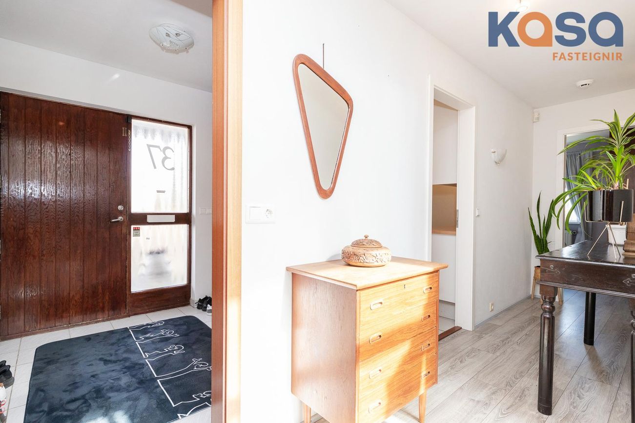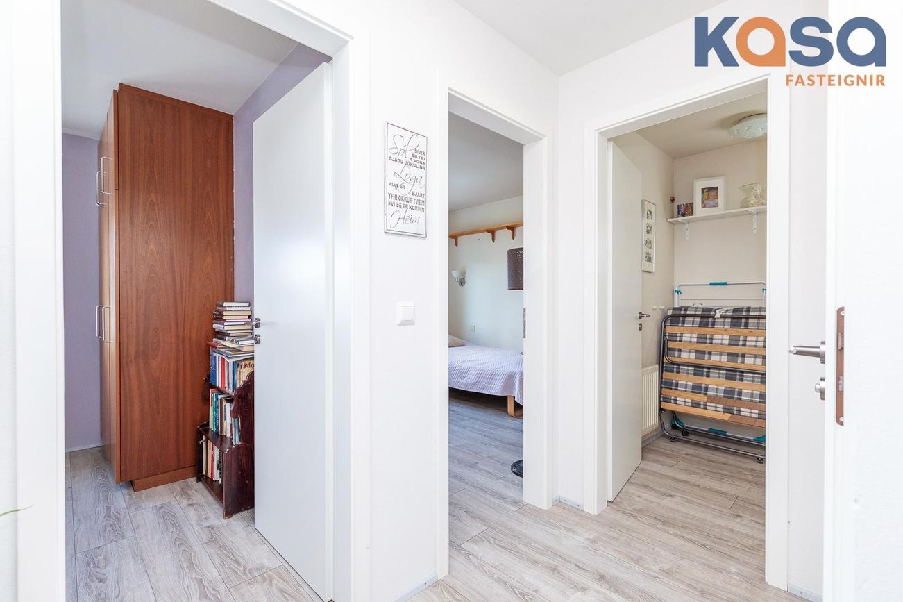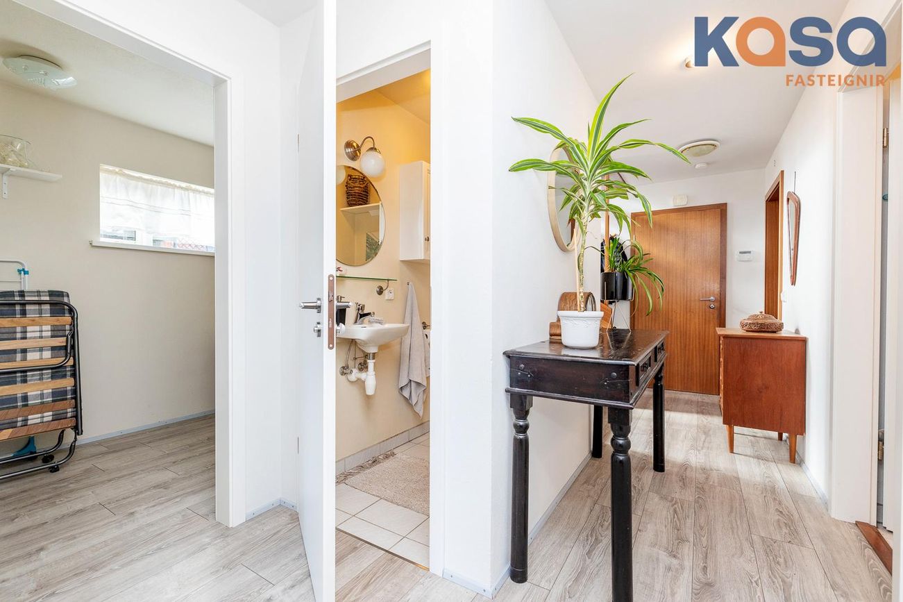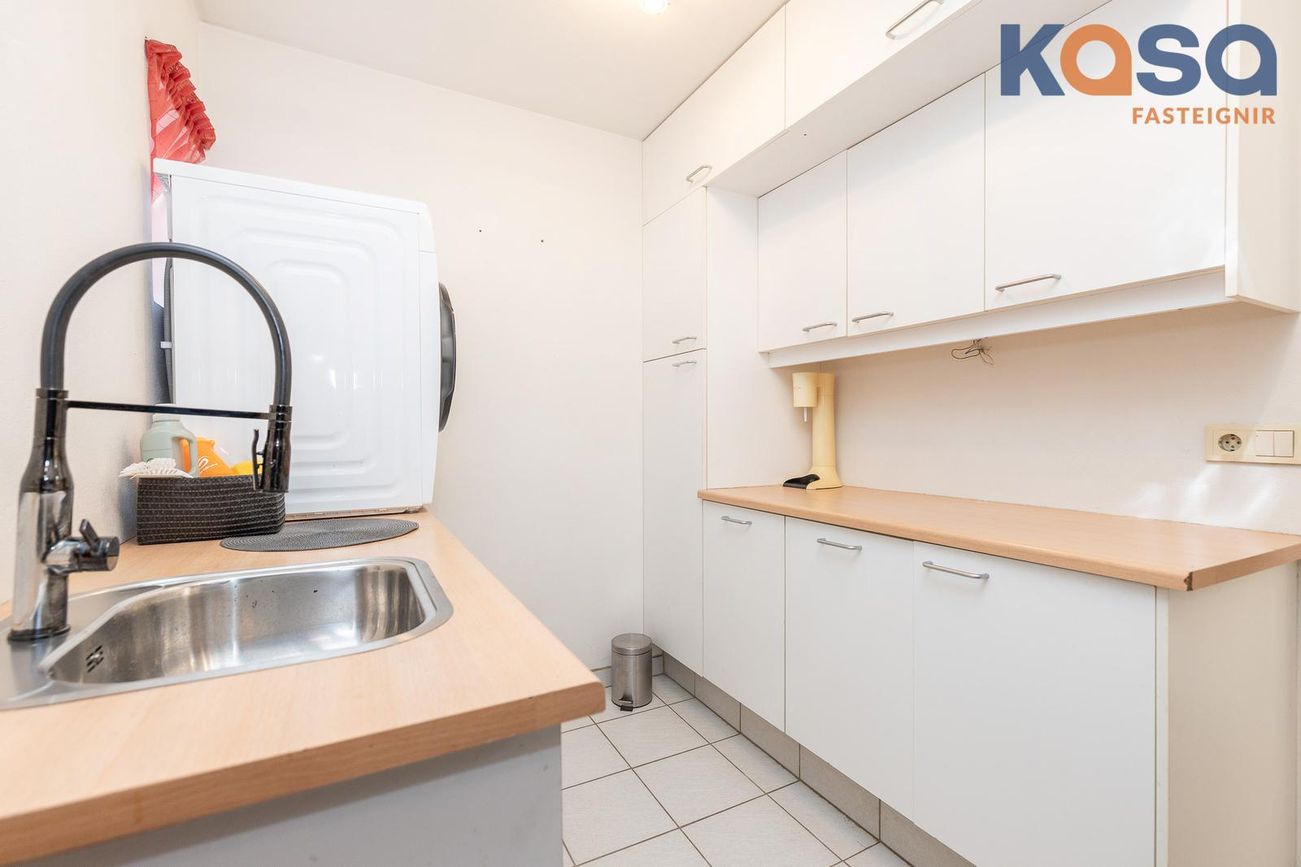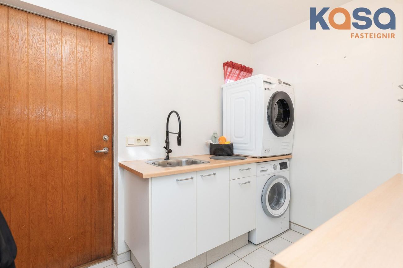 Þvottahús: Þar er hvít innrétting með ágætu skápa og skúffuplássi. Vaskur er í borðplötu og pláss fyrir þvottavél og þurrkara. Í þvottahúsinu er einnig inngangur í eignina. Flísar á gólfum.