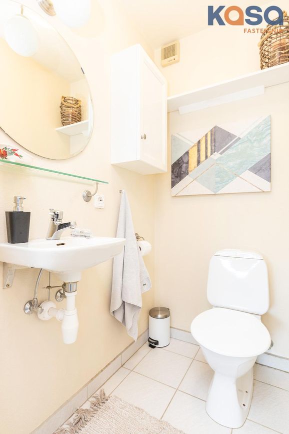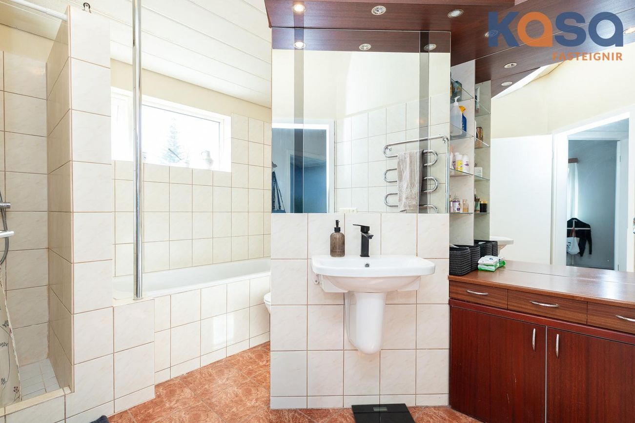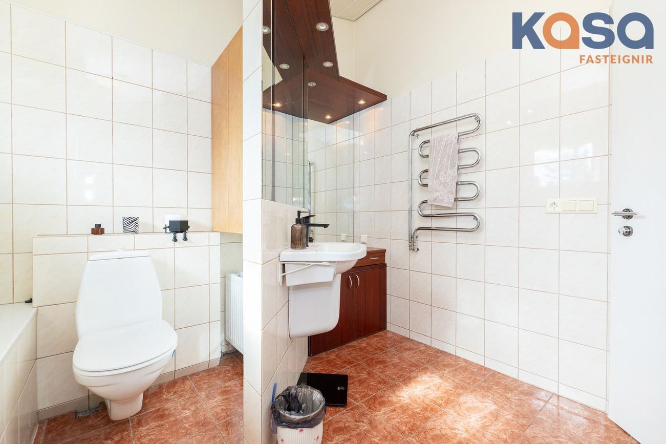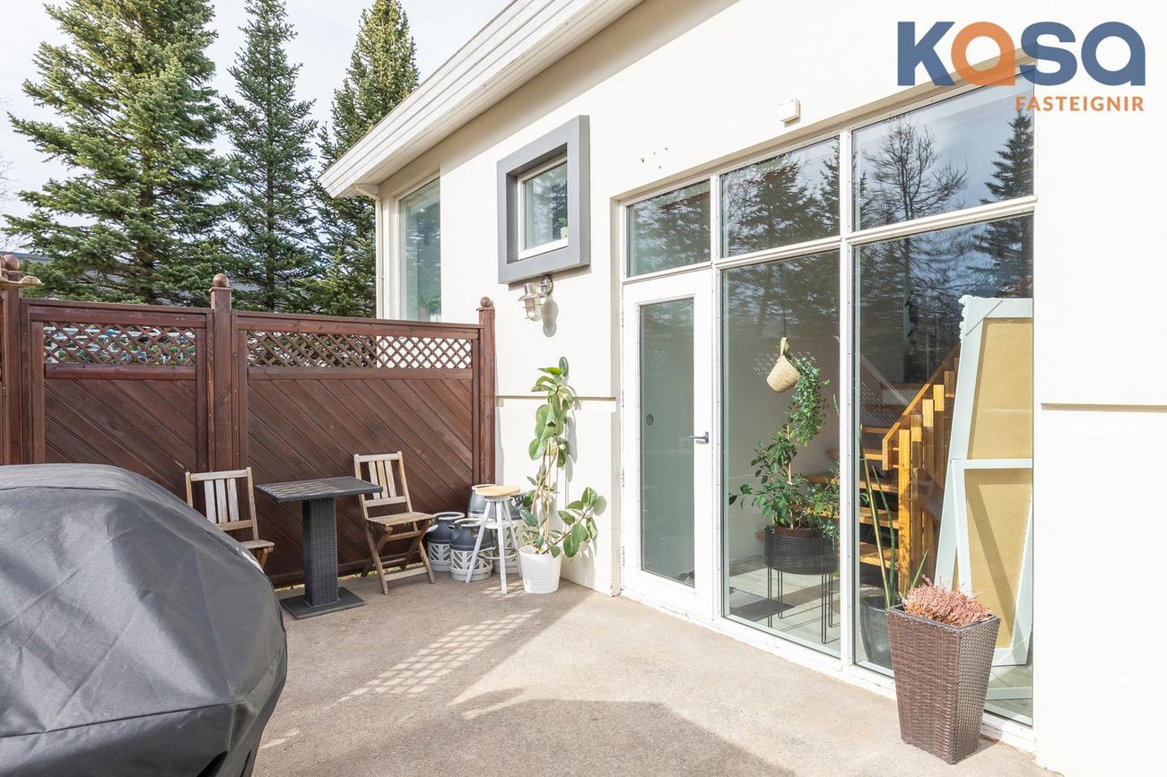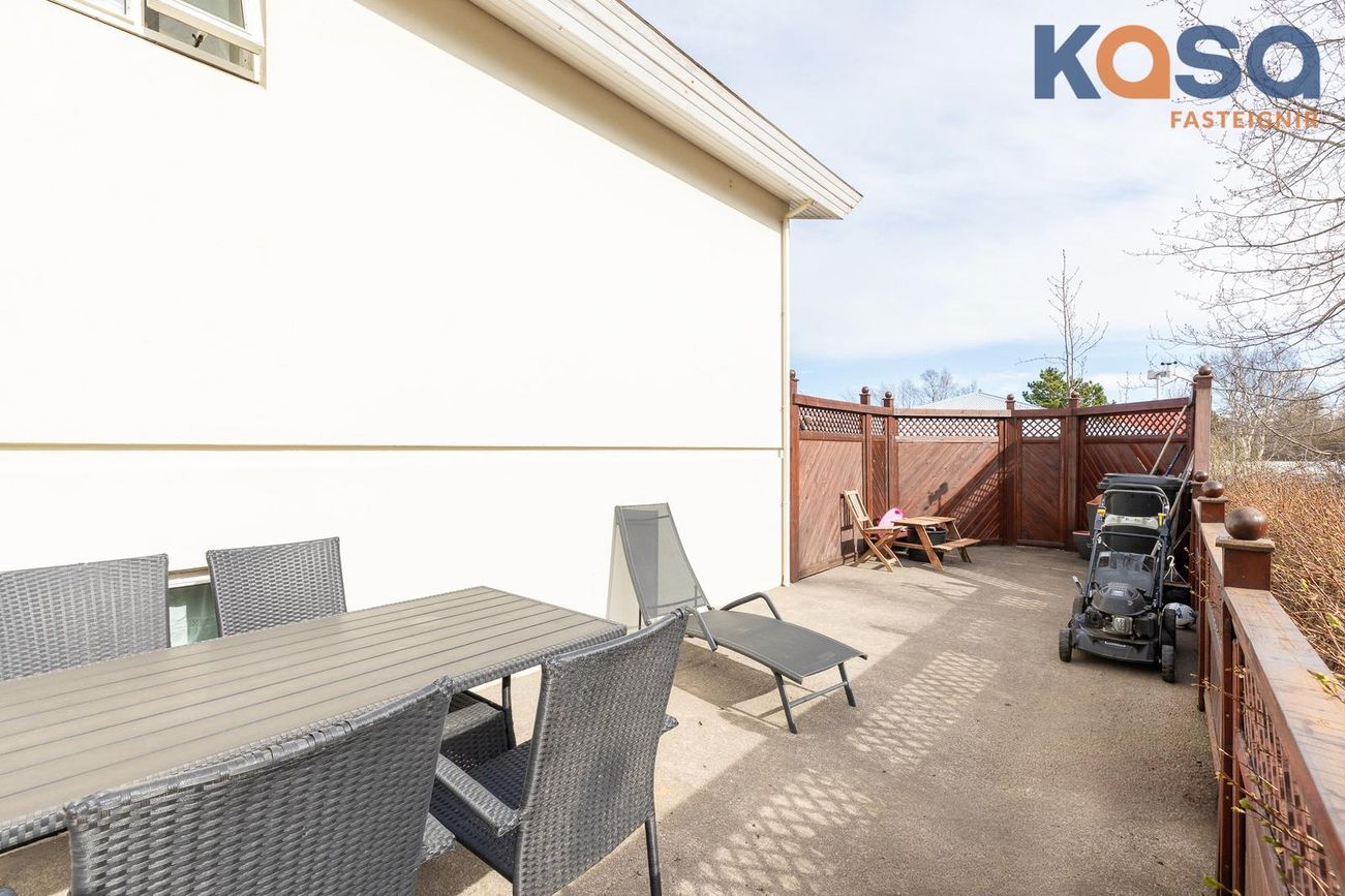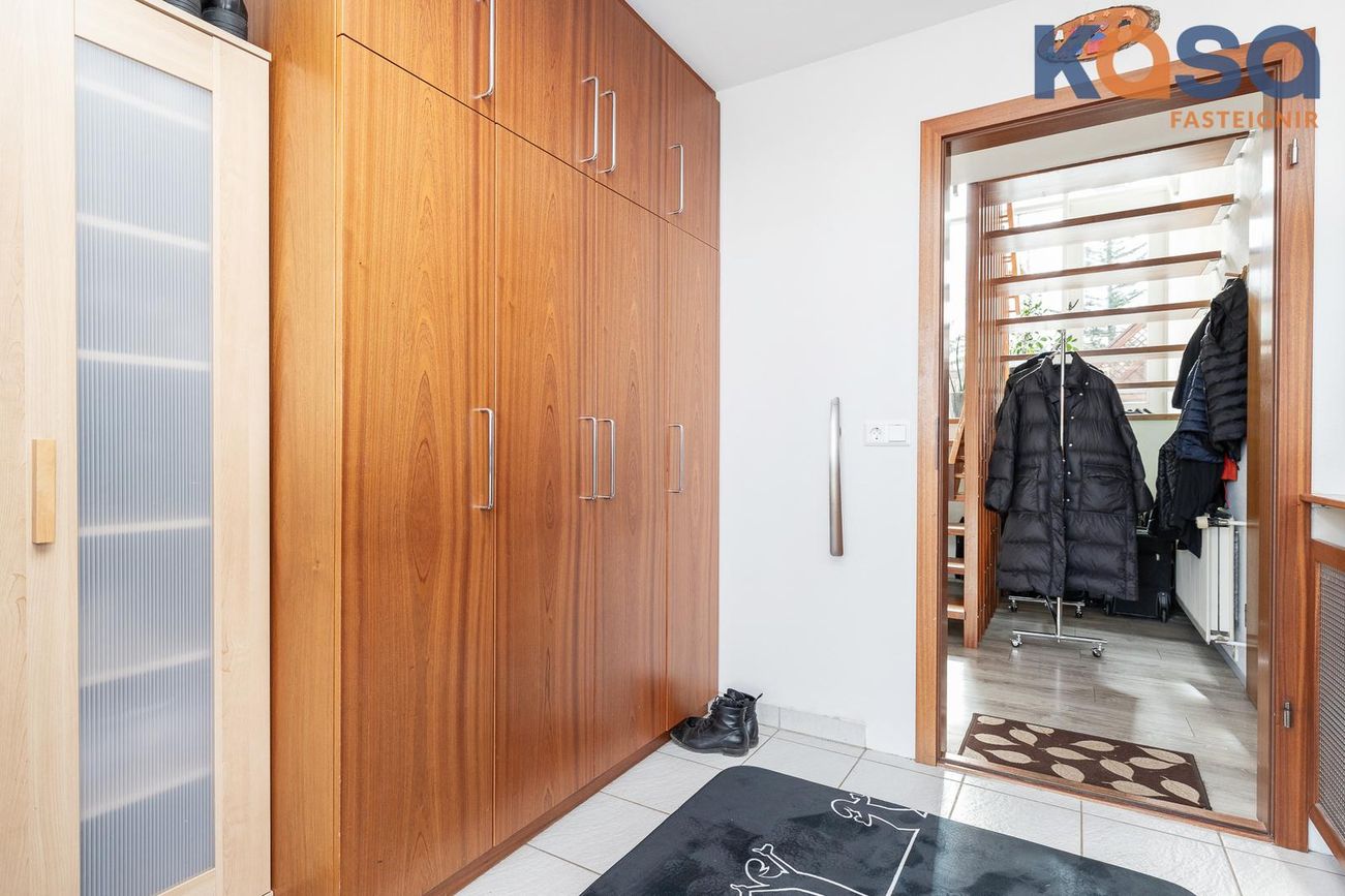 Þvottahús: Þar er hvít innrétting með ágætu skápa og skúffuplássi. Vaskur er í borðplötu og pláss fyrir þvottavél og þurrkara. Í þvottahúsinu er einnig inngangur í eignina. Flísar á gólfum.