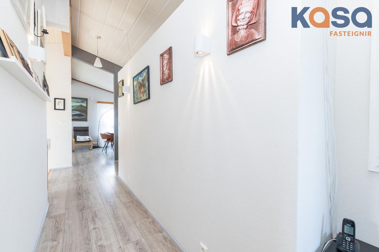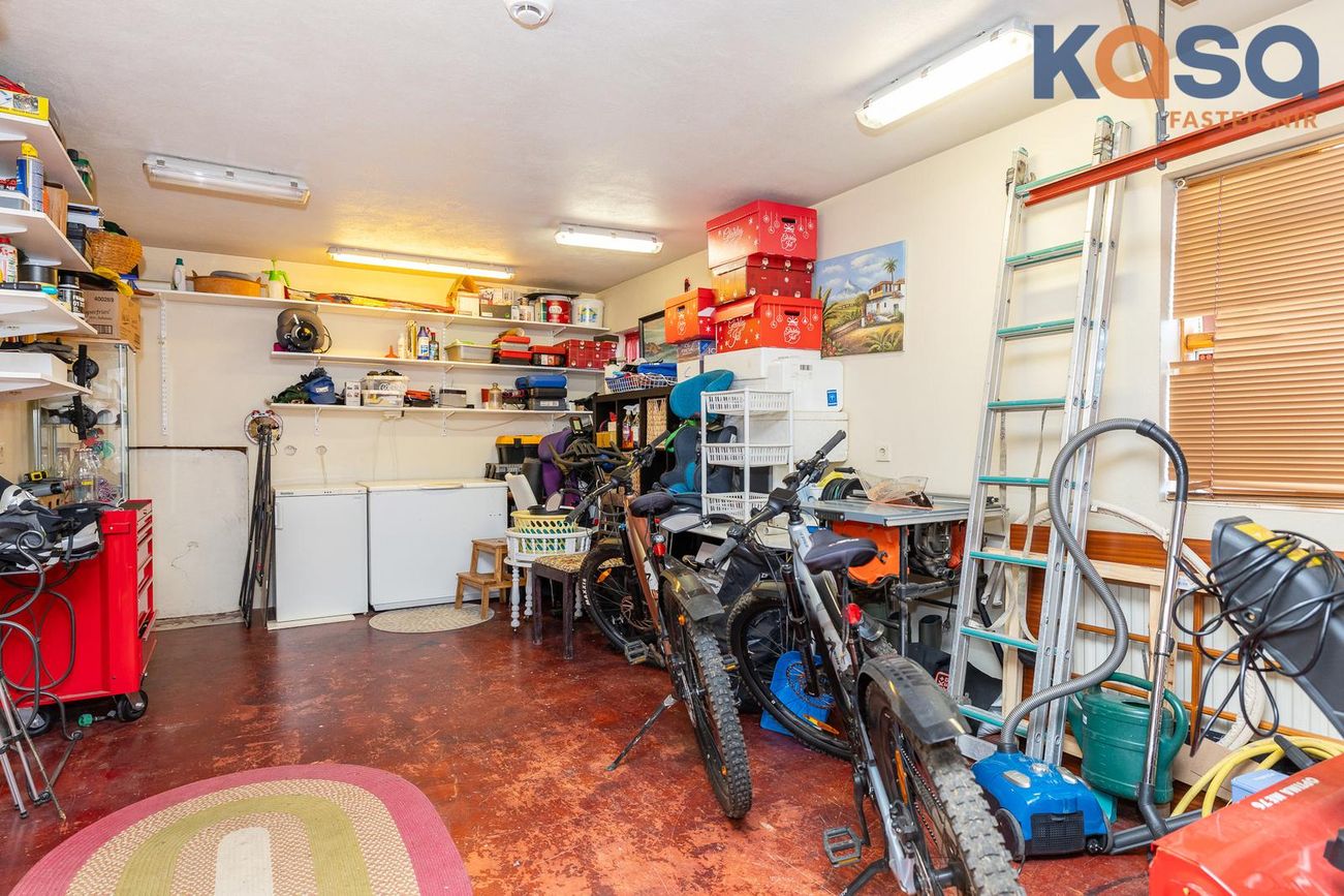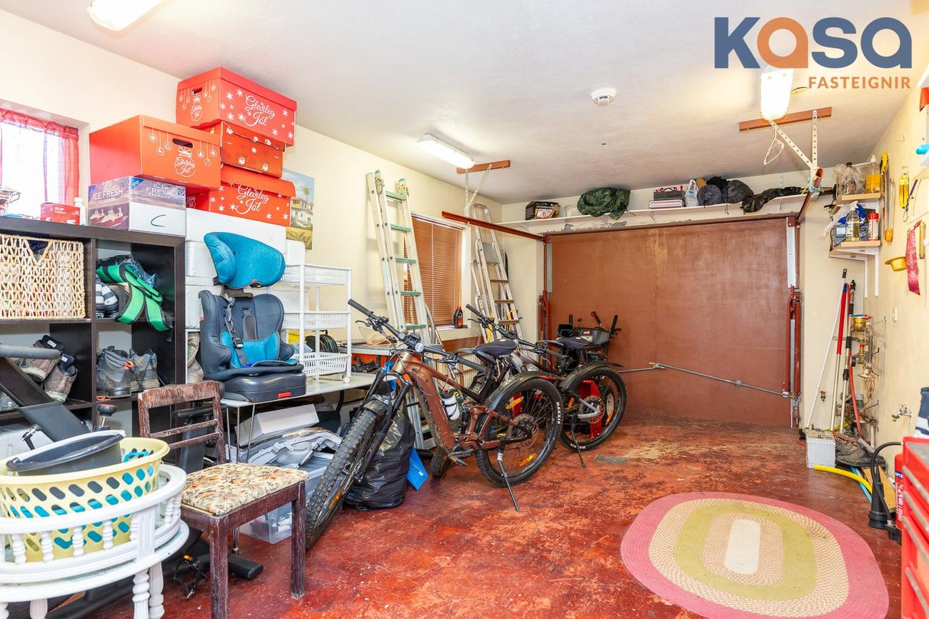 Bílskúr: Er með lökkuðu gólfi. Innkeyrsluhurð er ekki rafdrifin. Inn af bílskúr er köld geymsla ásamt lítill geymslu undir stiga.