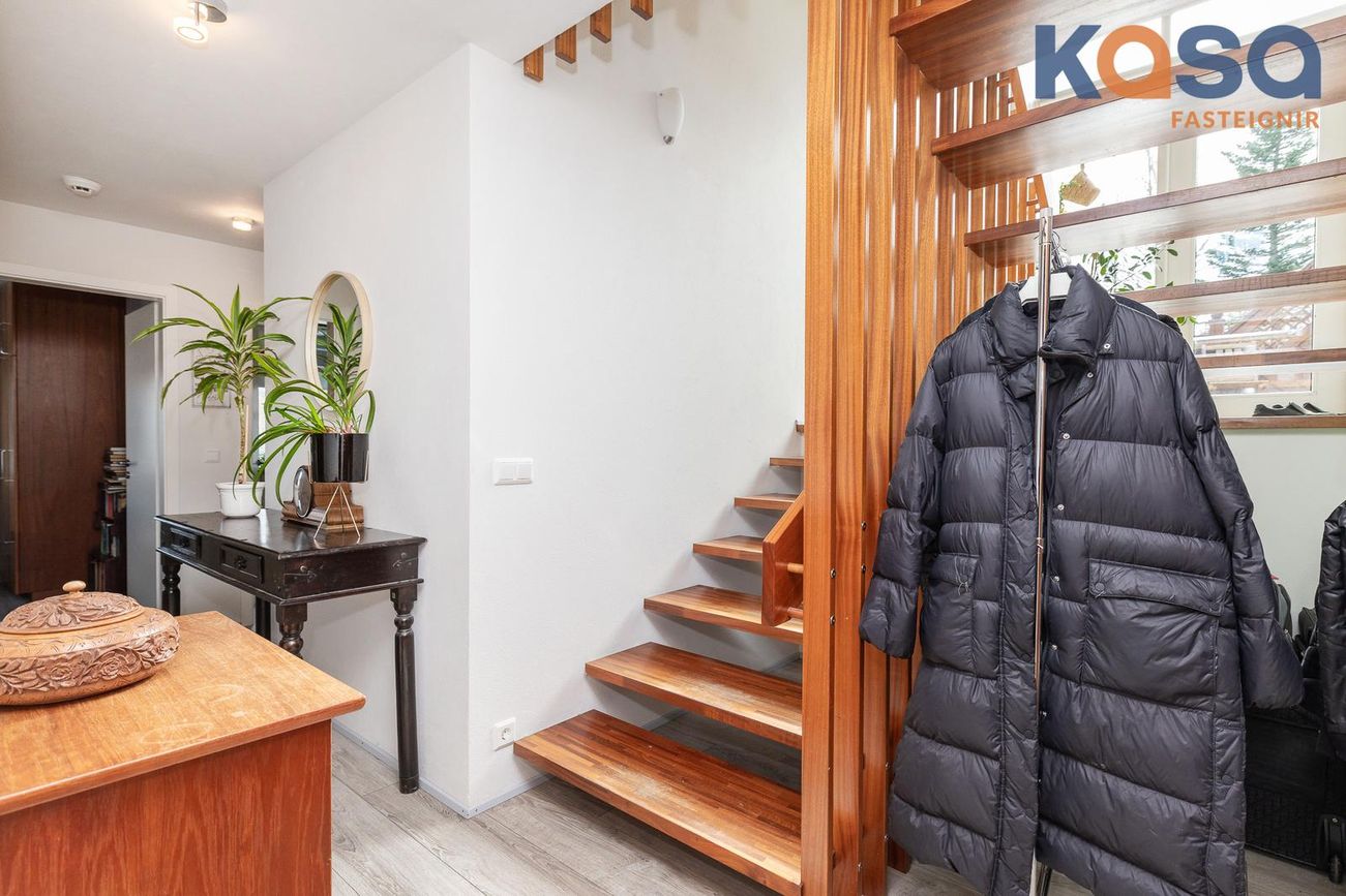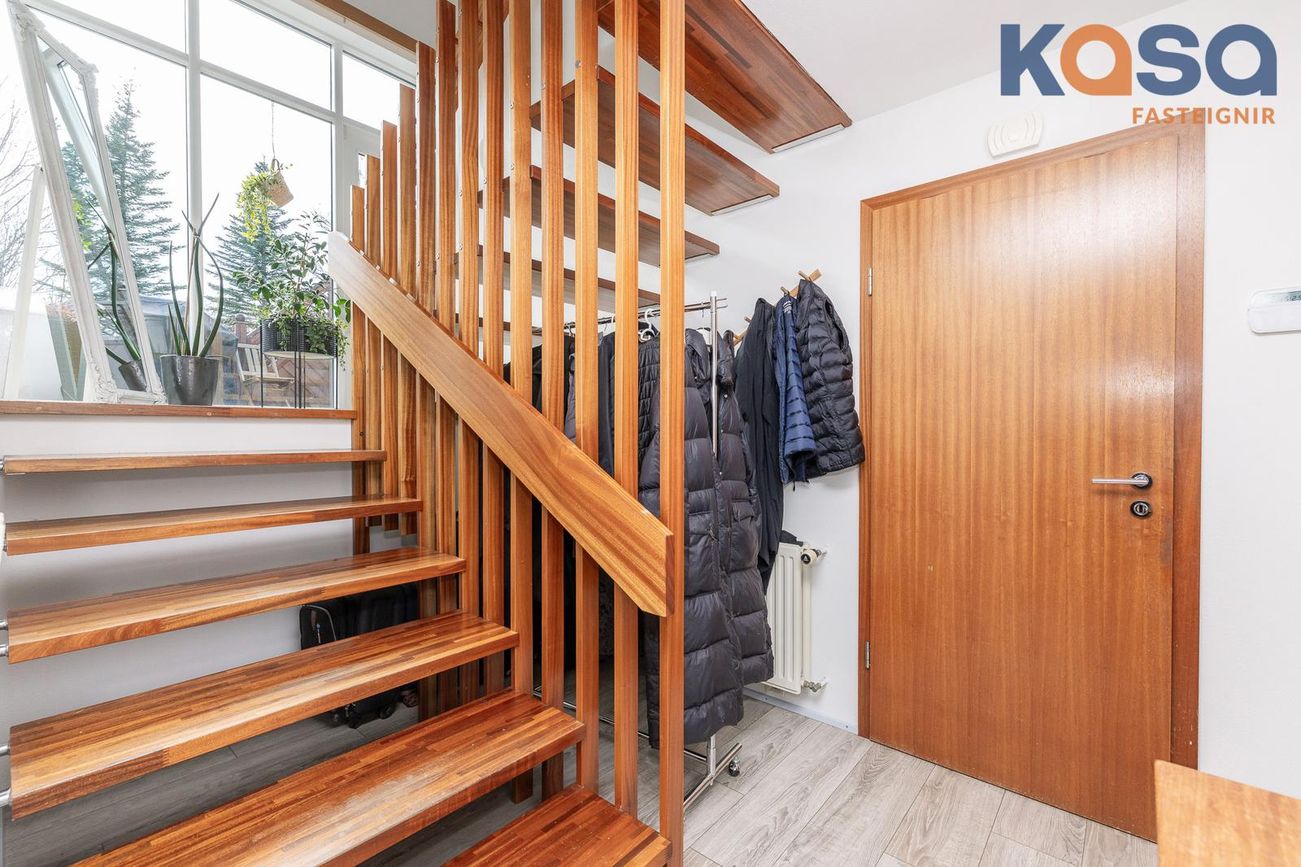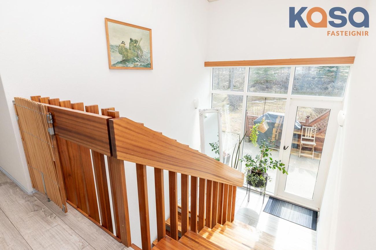 Stigi á milli hæða er úr timbri. Á stigapalli er gengið út á vestur