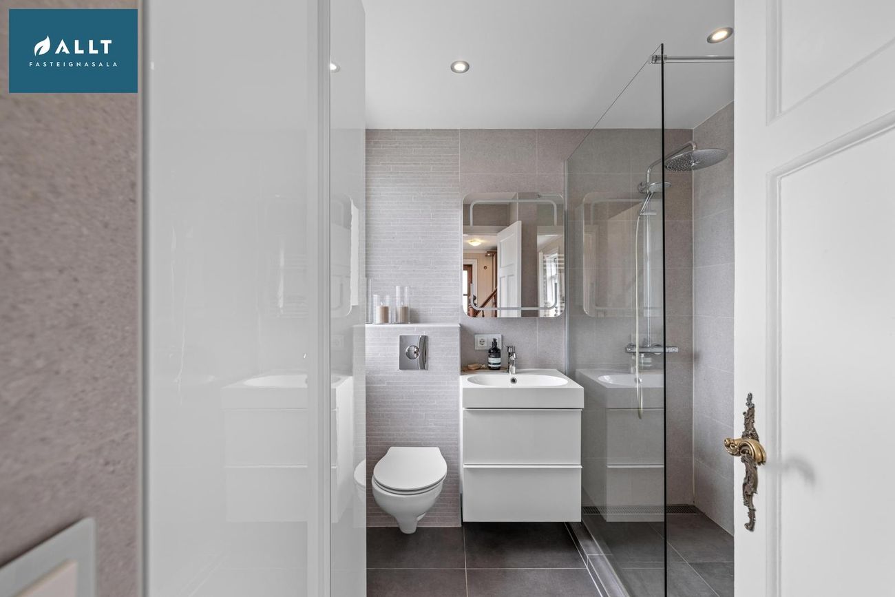 Baðherbergi á fyrstu hæð er með walk-in sturtu, flísar í hólf og gólf.