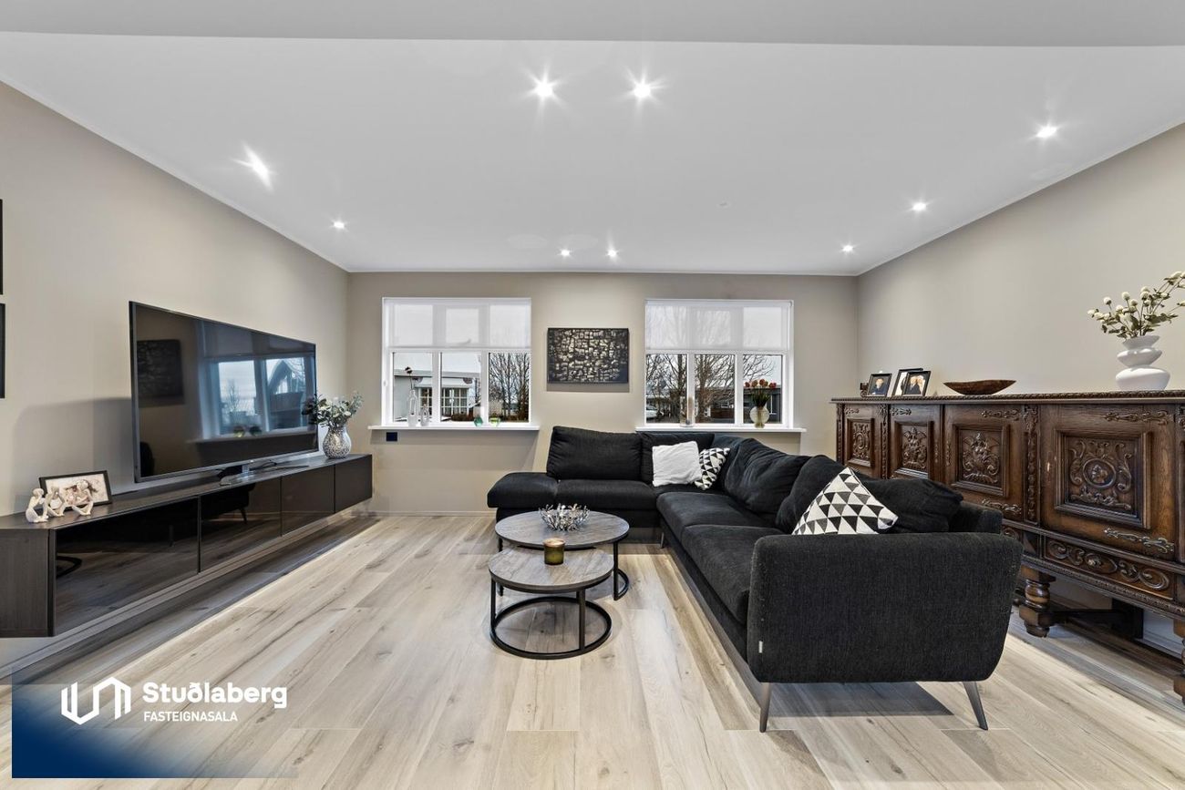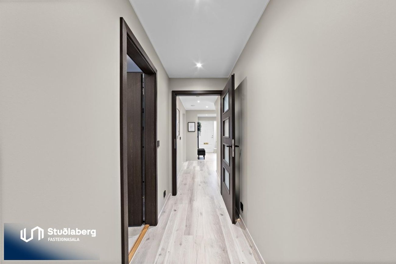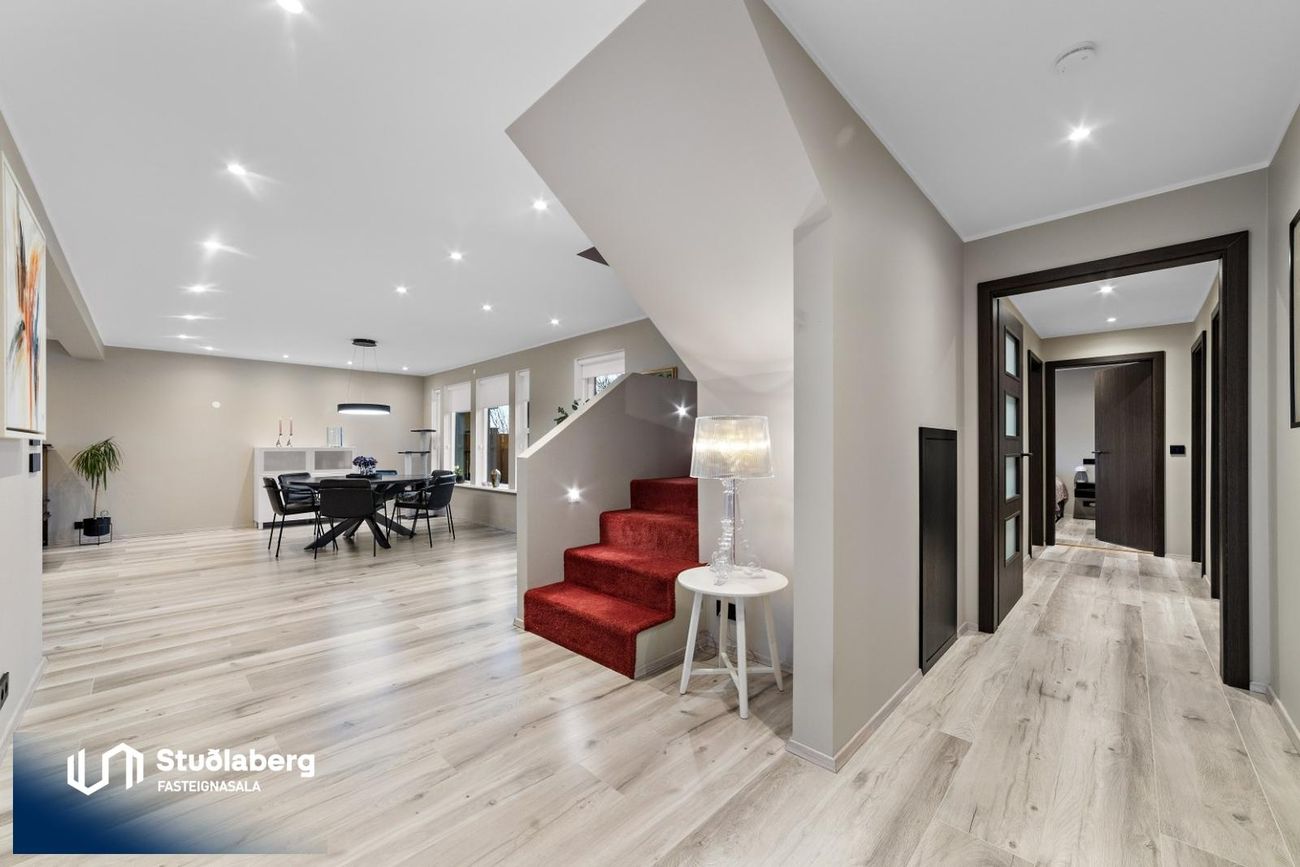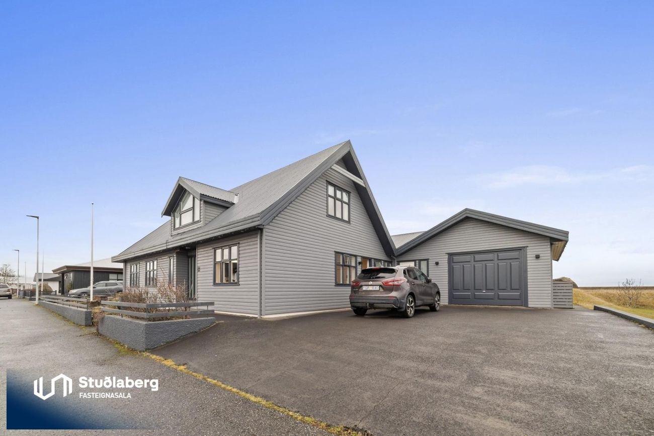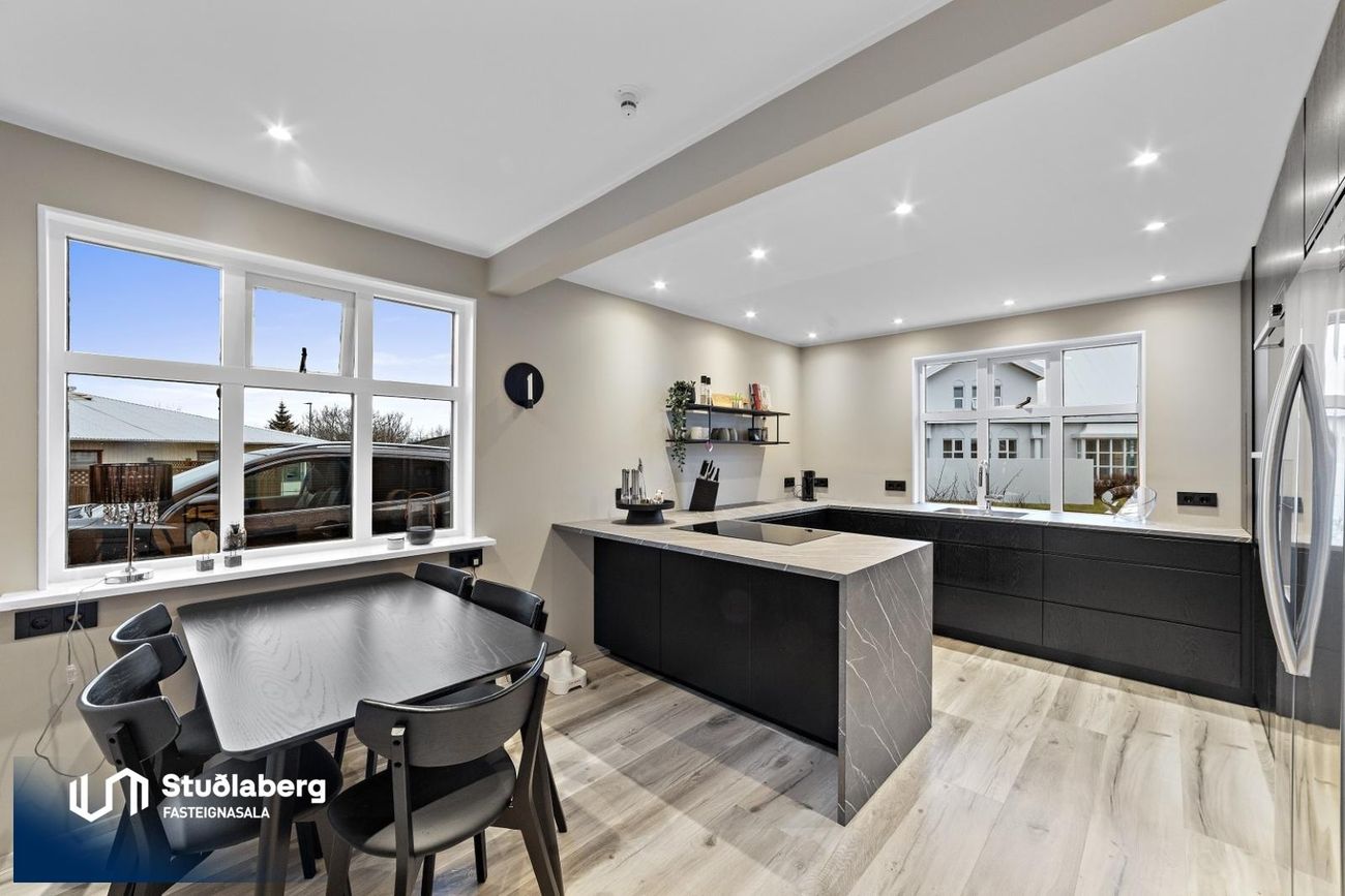 Tvö hæða einbýlishús með opnum rýmum, parketgólfum og flísalögðum gólfum. Bílskúr með epoxy gólfi og útigöngu á baklóð.