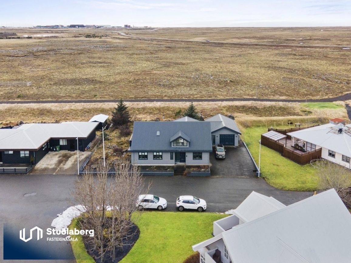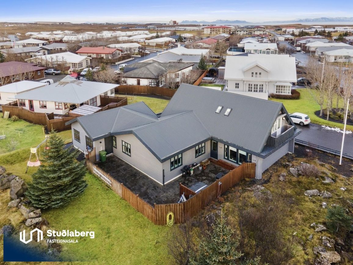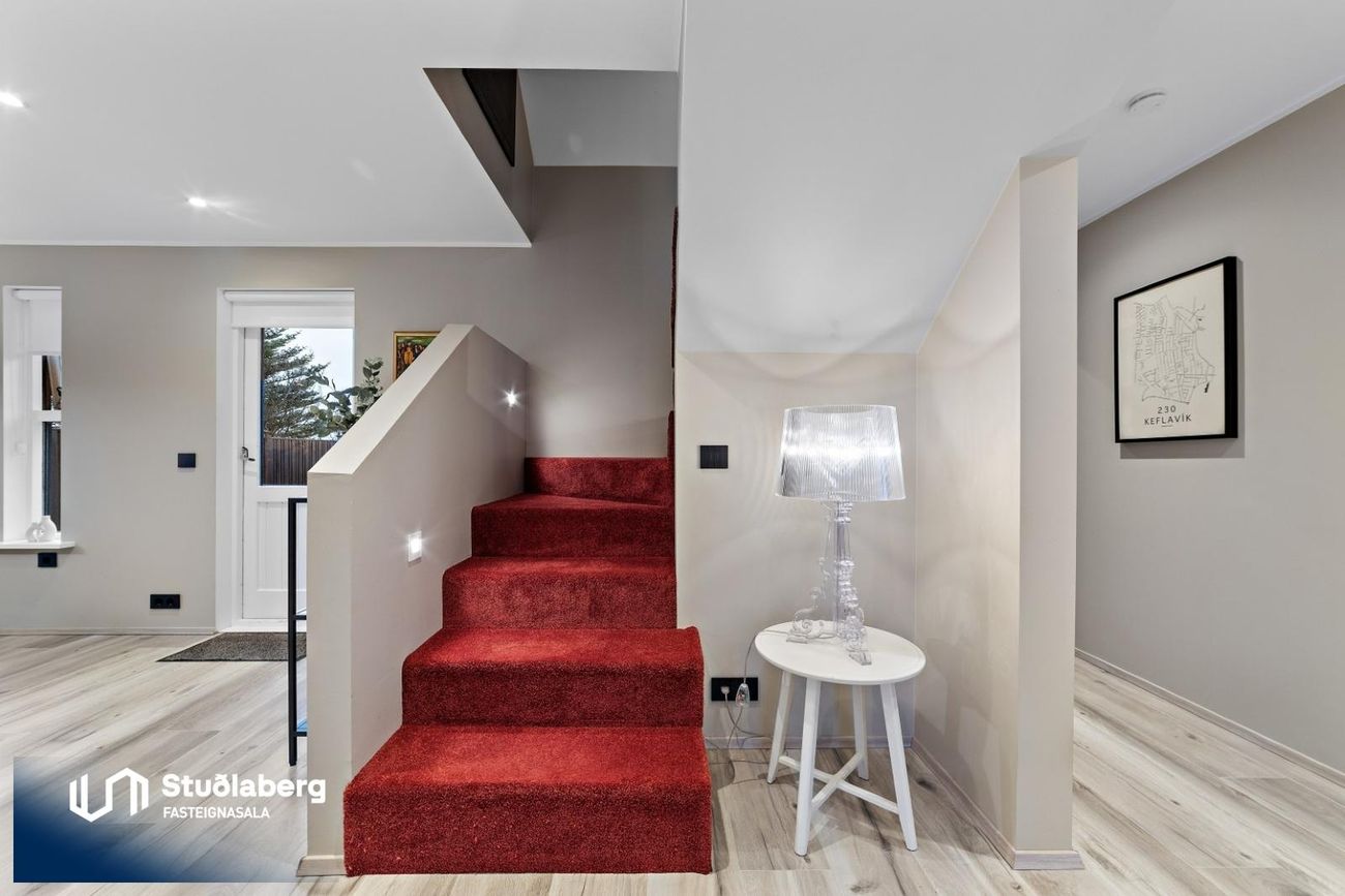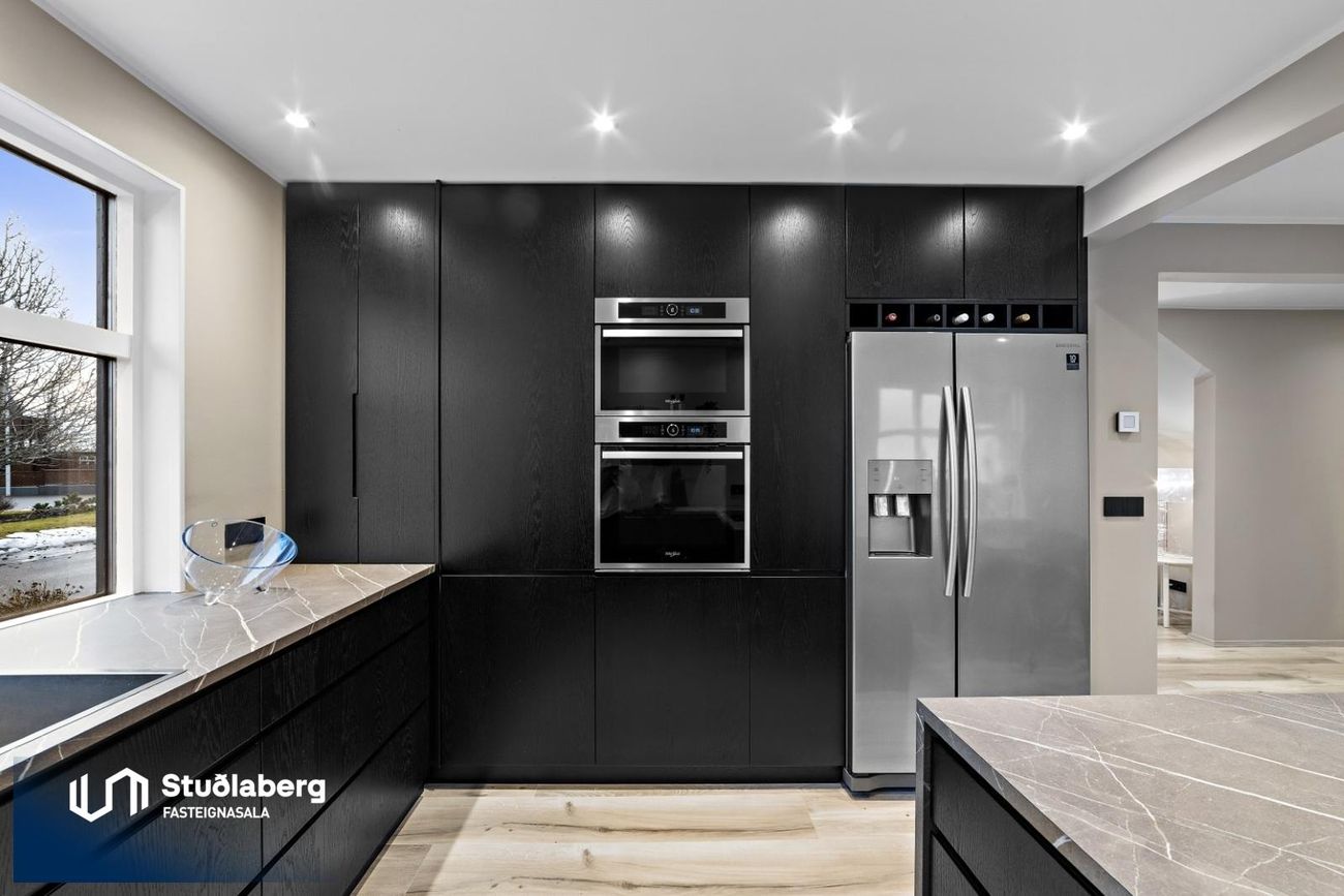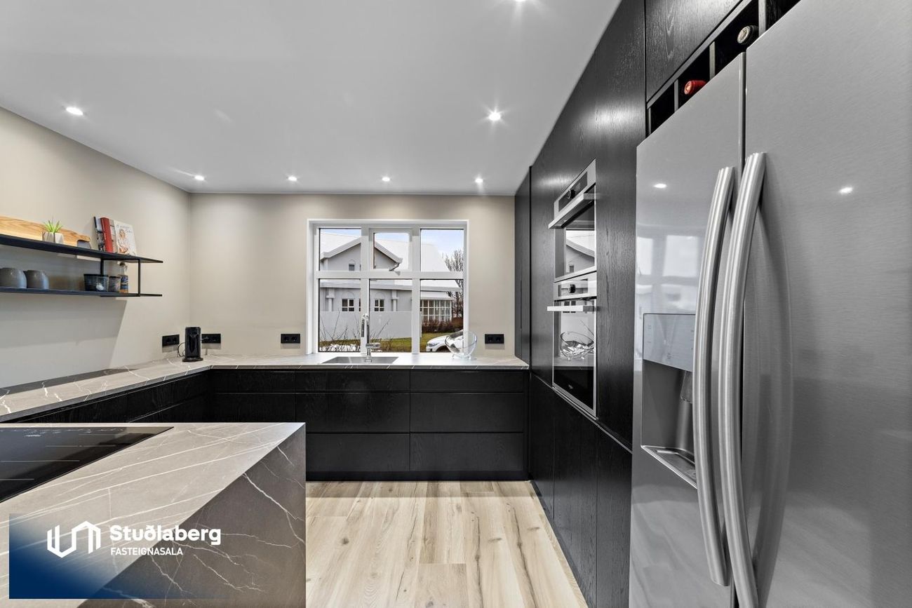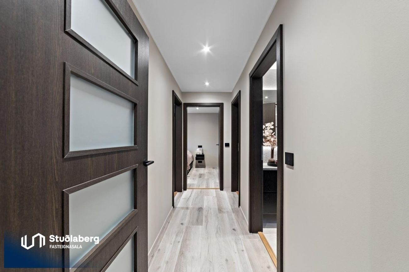 Tvö hæða einbýlishús með opnum rýmum, parketgólfum og flísalögðum gólfum. Bílskúr með epoxy gólfi og útigöngu á baklóð.