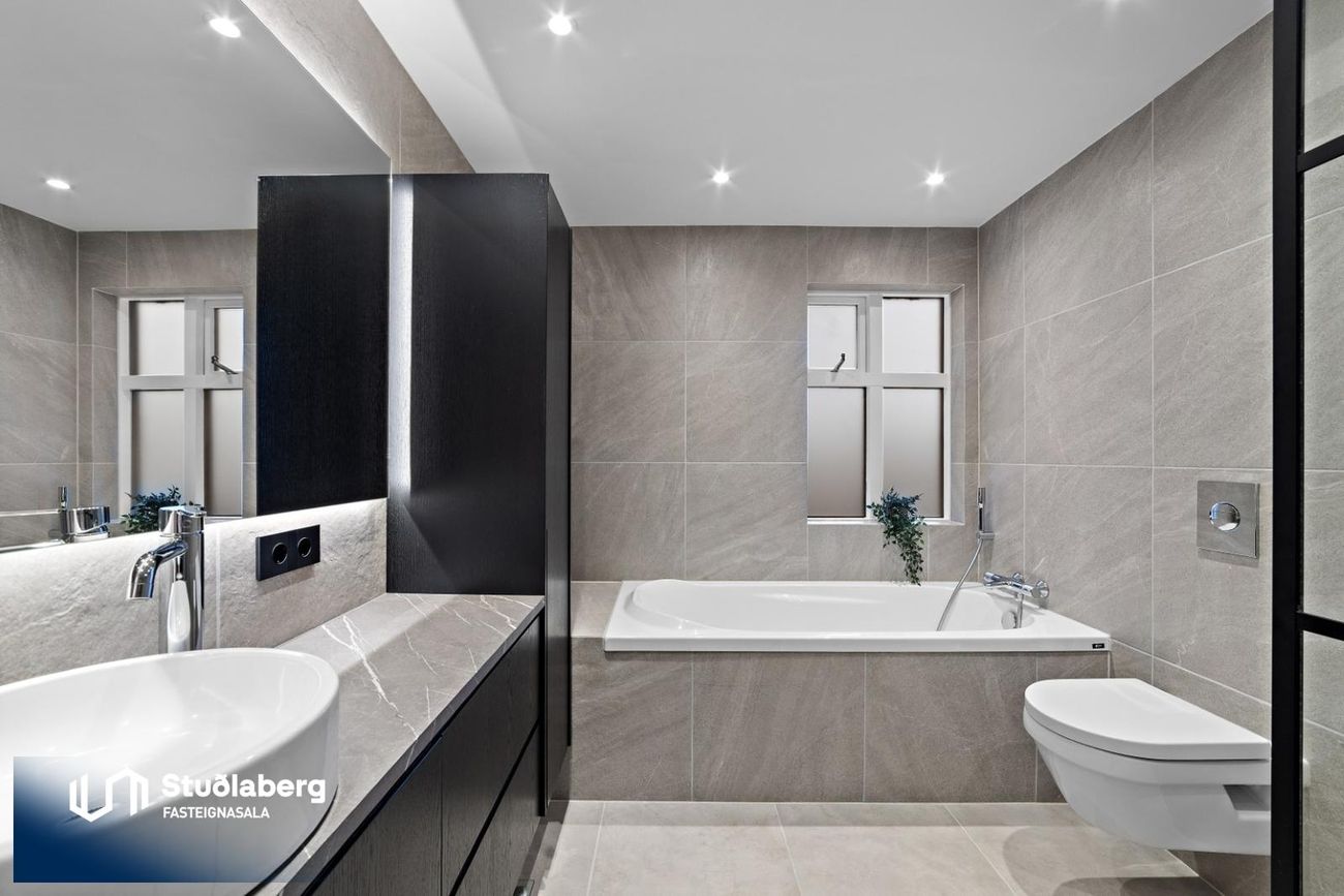 Baðherbergi á neðri hæð með flísklæddum gólfum og veggjum, baðkari, sturtu og handklæðaofni. Baðherbergi á efri hæð með sturtuklefa.