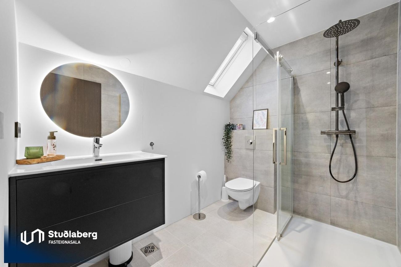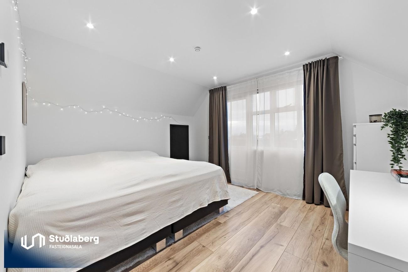 Fjórar geymslur á efri hæð og geymsluloft yfir bílskúr.