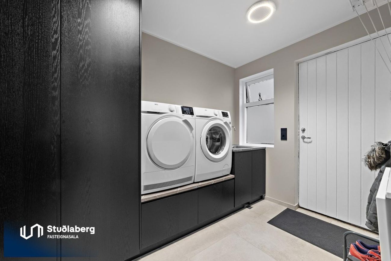 Þvottahús með flísklæddu gólfi, aðstaða fyrir þvottavél og þurrkara, útiganga á plan.