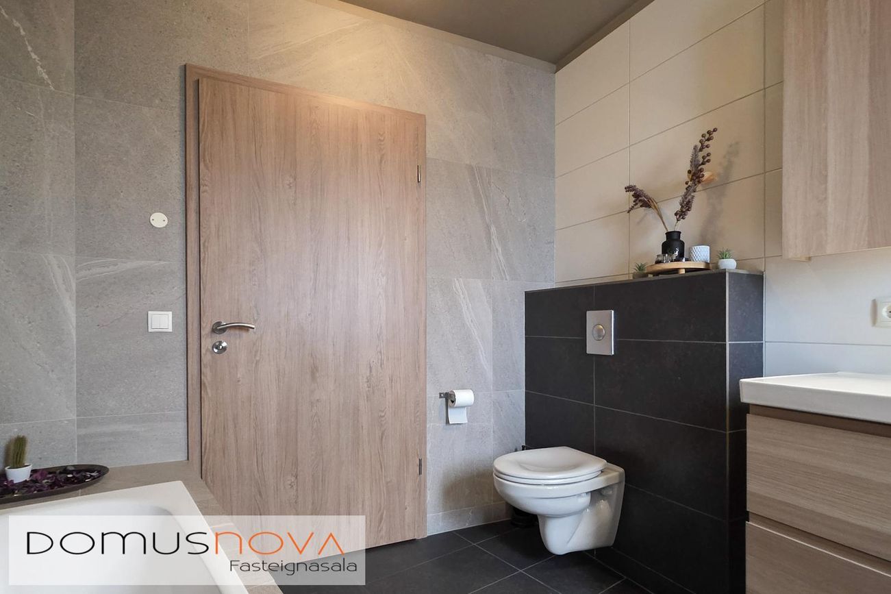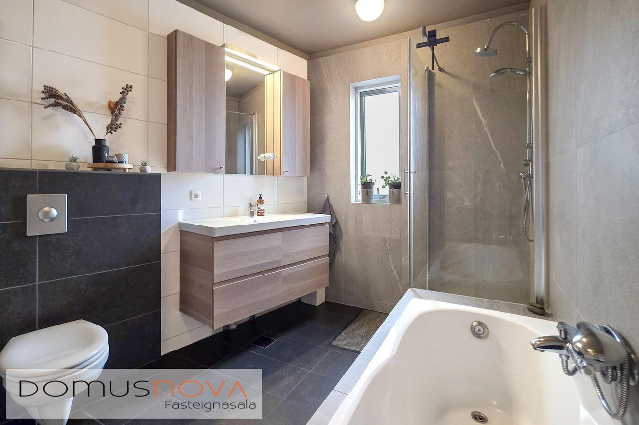 Baðherbergi: Viðarinnrétting með efri skápum. Baðkar. Sturta. Upphengt salerni. Veggflísar. Flísar á gólfi.
