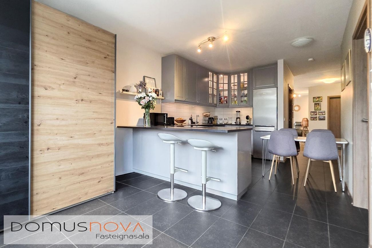 Eldhús: U - laga innrétting með efri og neðri skápum með góðu skápaplássi. Hvítar veggflísar á milli skápa. Við enda borðplötu er gert ráð fyrir 3-4 háum stólum. Parket á gólfi.