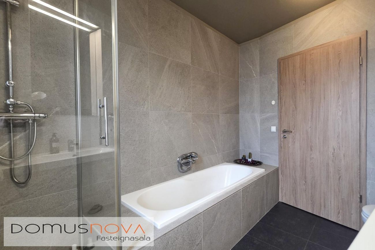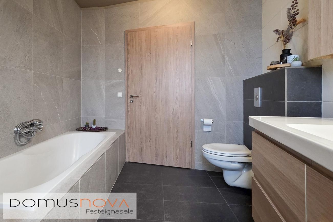 Baðherbergi: Viðarinnrétting með efri skápum. Baðkar. Sturta. Upphengt salerni. Veggflísar. Flísar á gólfi.