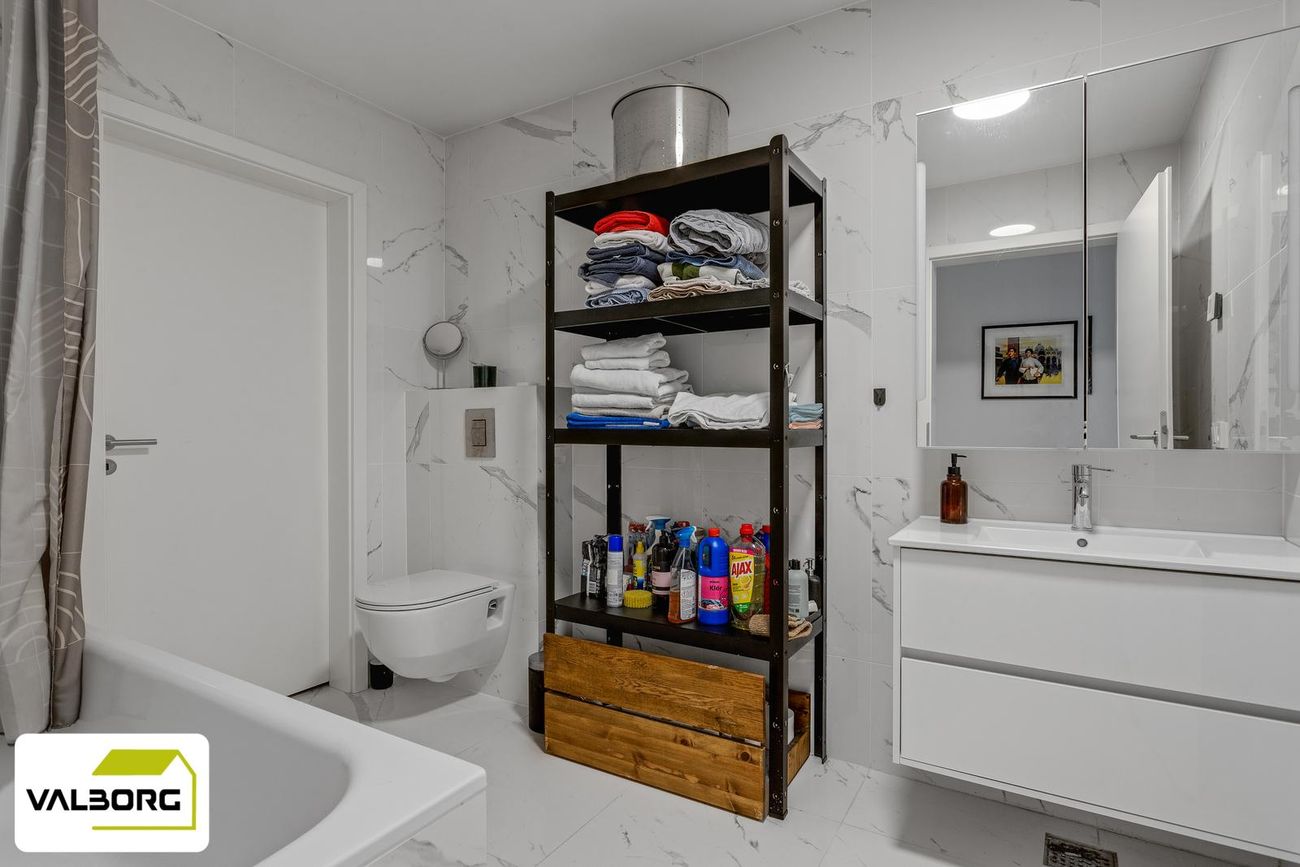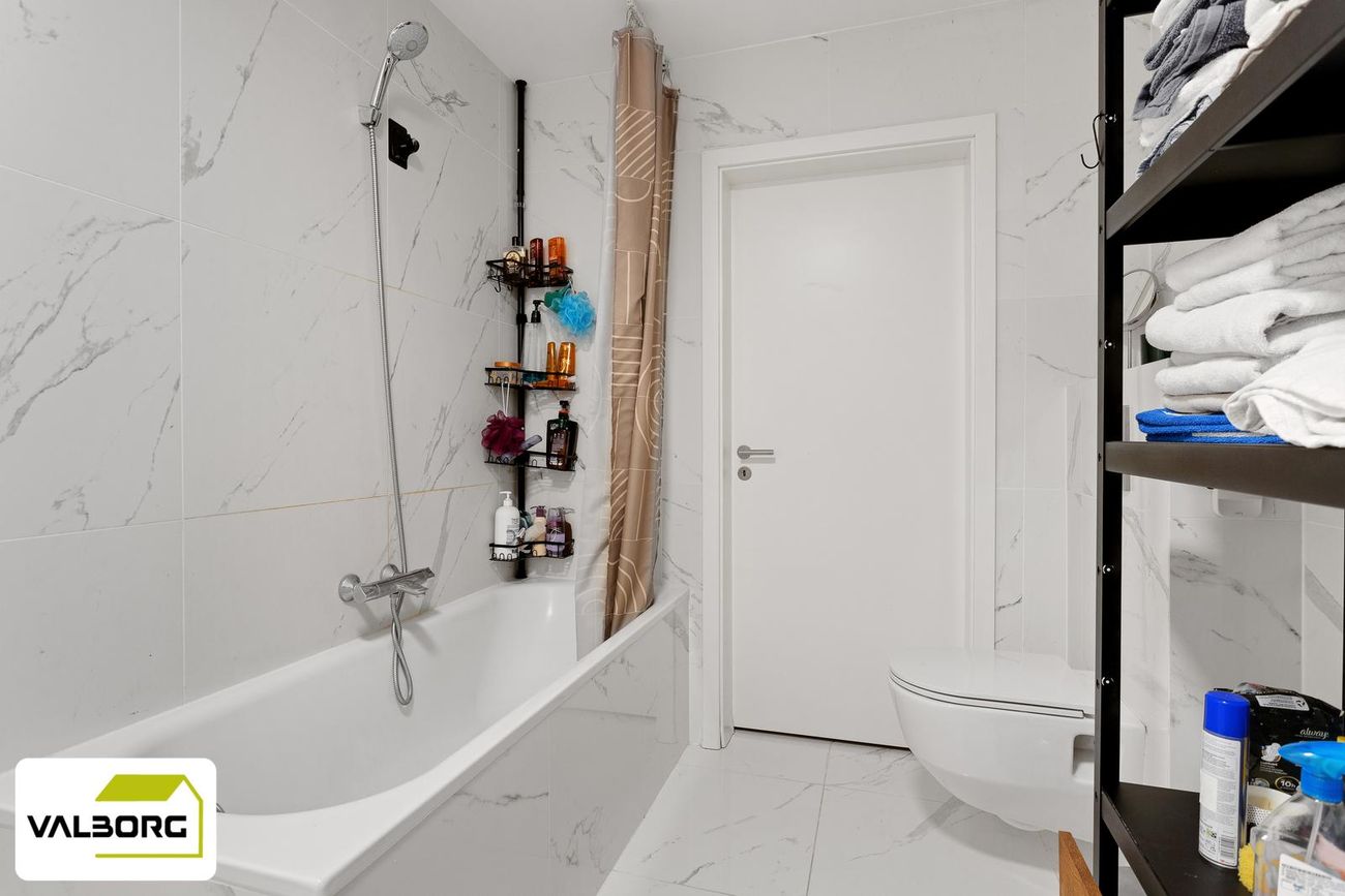 Baðherbergi er flísalagt í hólf & gólf með ljósum flísum. Upphengt wc, baðkar með sturtu og innrétting með handlaug.
