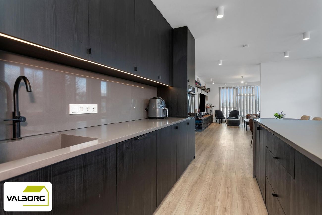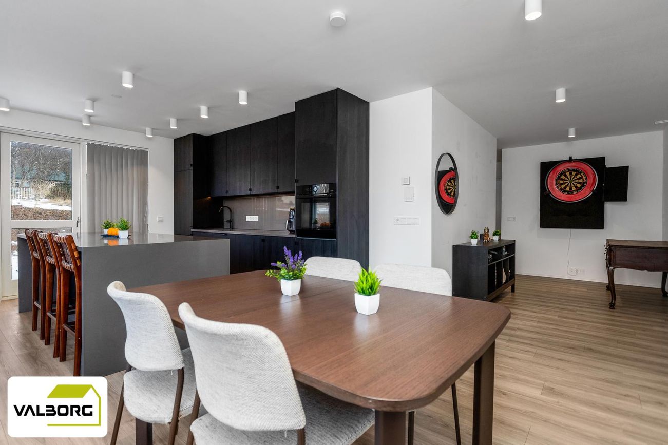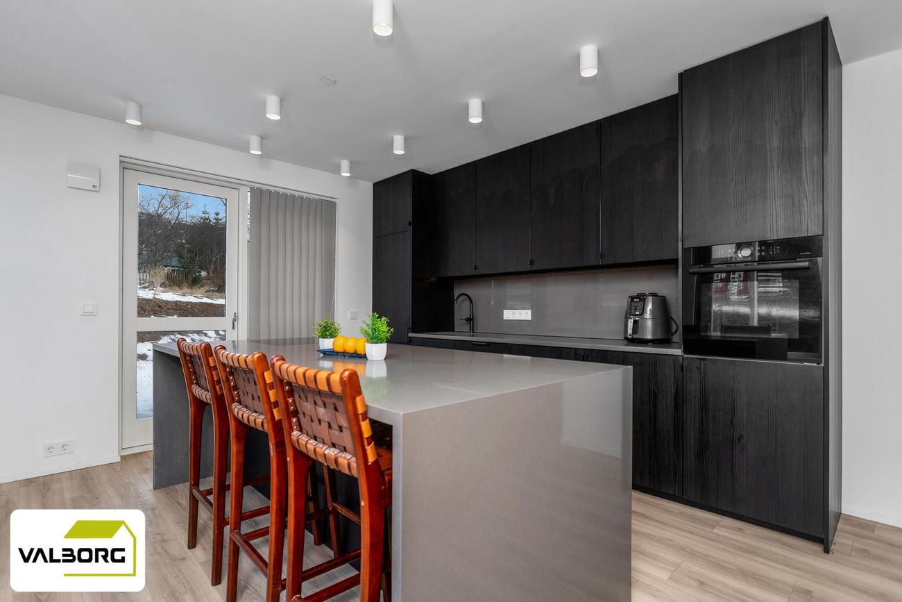Eldhús er í opnu rými með stofu. Þar er góð eldhúsinnrétting með efri og neðri skápum, eyja með helluborði og góðri vinnuaðstöðu. Bakarofn í vinnuhæð, innbyggð uppþvottavél og innbyggður ísskápur. Grár steinn á eyju og borðplötu. Frá eldhúsi er útgengt á baklóð.